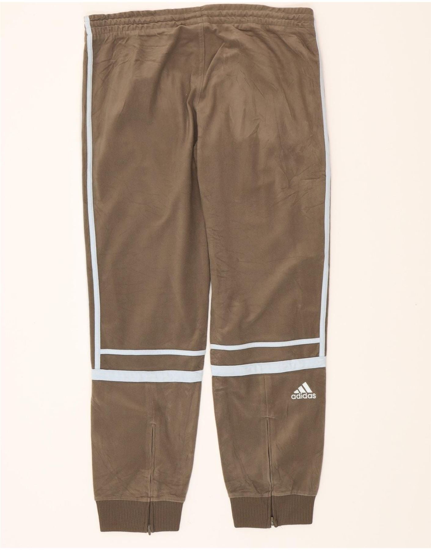 - AI Description: This Adidas womens tracksuit trousers joggers are crafted from soft khaki velour. The 100 percent polyester fabric offers a luxurious texture. They feature a comfortable pull on elastic waist for an easy fit. Cuffed ankles and practical pockets add functional detail. A subtle logo accent completes the regular comfort fit design.