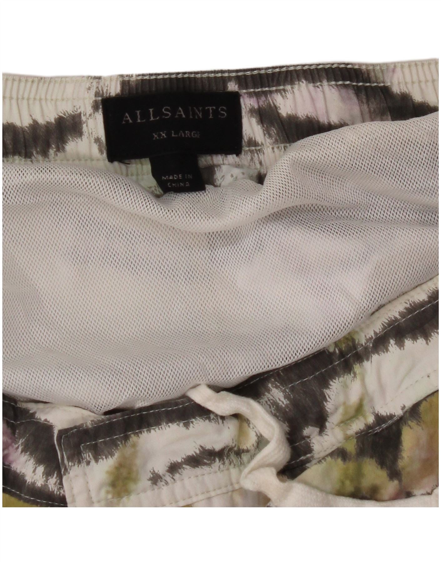 - AI Description: This All Saints mens swimming shorts are crafted from a woven fabric. They feature a vibrant multicoloured animal print, evoking a tropical style. The regular fit and elasticated waist ensure comfort and ease of movement. A drawstring closure provides an adjustable fit. Fully lined for practicality, these shorts are ideal for warm weather. The bold pattern adds a distinctive touch.