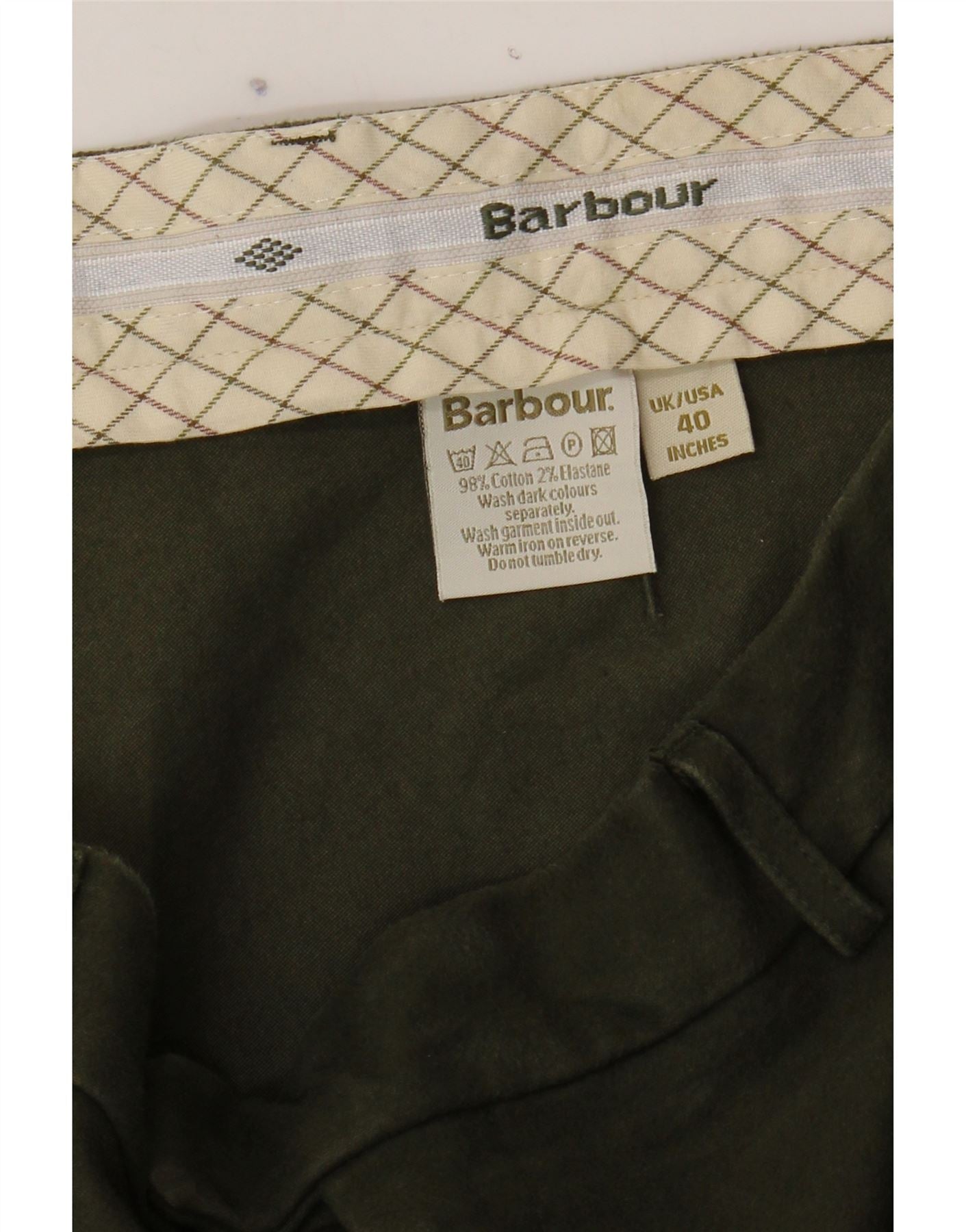 - AI Description: Barbour men's green Capri trousers, size 40. Crafted from a woven cotton blend (98% cotton, 2% elastane) for a comfortable regular fit. These classic trousers feature a button closure, pockets, and an adjustable waist. Accented with buttons. Pre-owned in good condition, with minor visible wear on the hem. Washing instructions: wash dark colours separately inside out, warm iron on reverse, do not tumble dry.