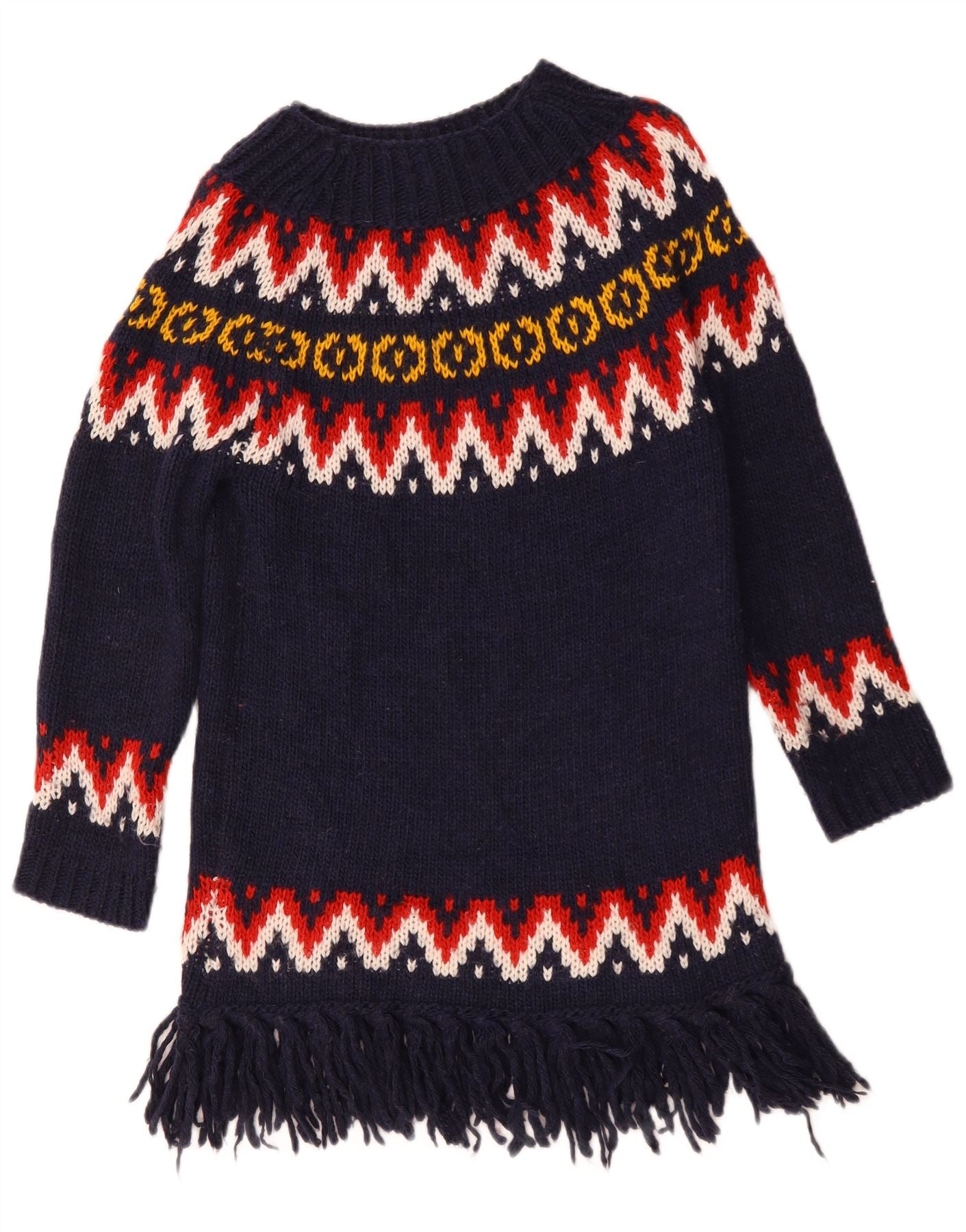 - AI opis: Ovaj ženski džemper United Colors Of Benetton izrađen je od udobnog tamnoplavog pletiva. Ima upečatljiv Fair Isle uzorak u crvenoj, bijeloj i žutoj boji preko prsa i rukava. Okrugli ovratnik i dugi rukavi daju tradicionalnu siluetu. Pravilan kroj osigurava udobno nošenje. Rub je završen razigranim detaljem resica. Ovaj stil pulovera kombinira toplinu s prepoznatljivom, klasičnom estetikom, savršen za ugodan izgled.