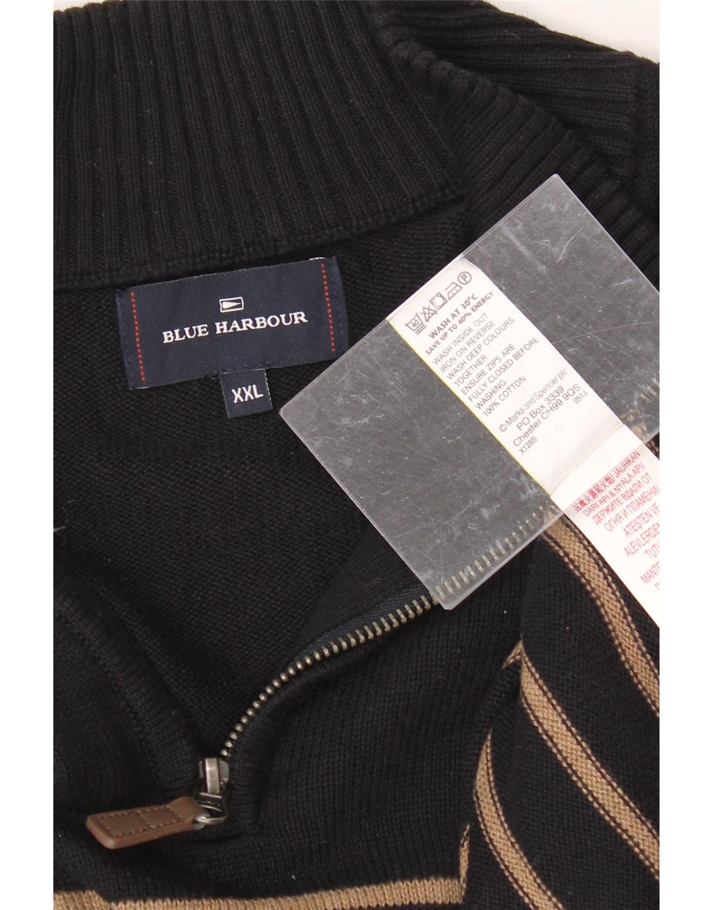 BLUE HARBOUR Mens Zip Neck Jumper Sweater 2XL Black Striped Cotton