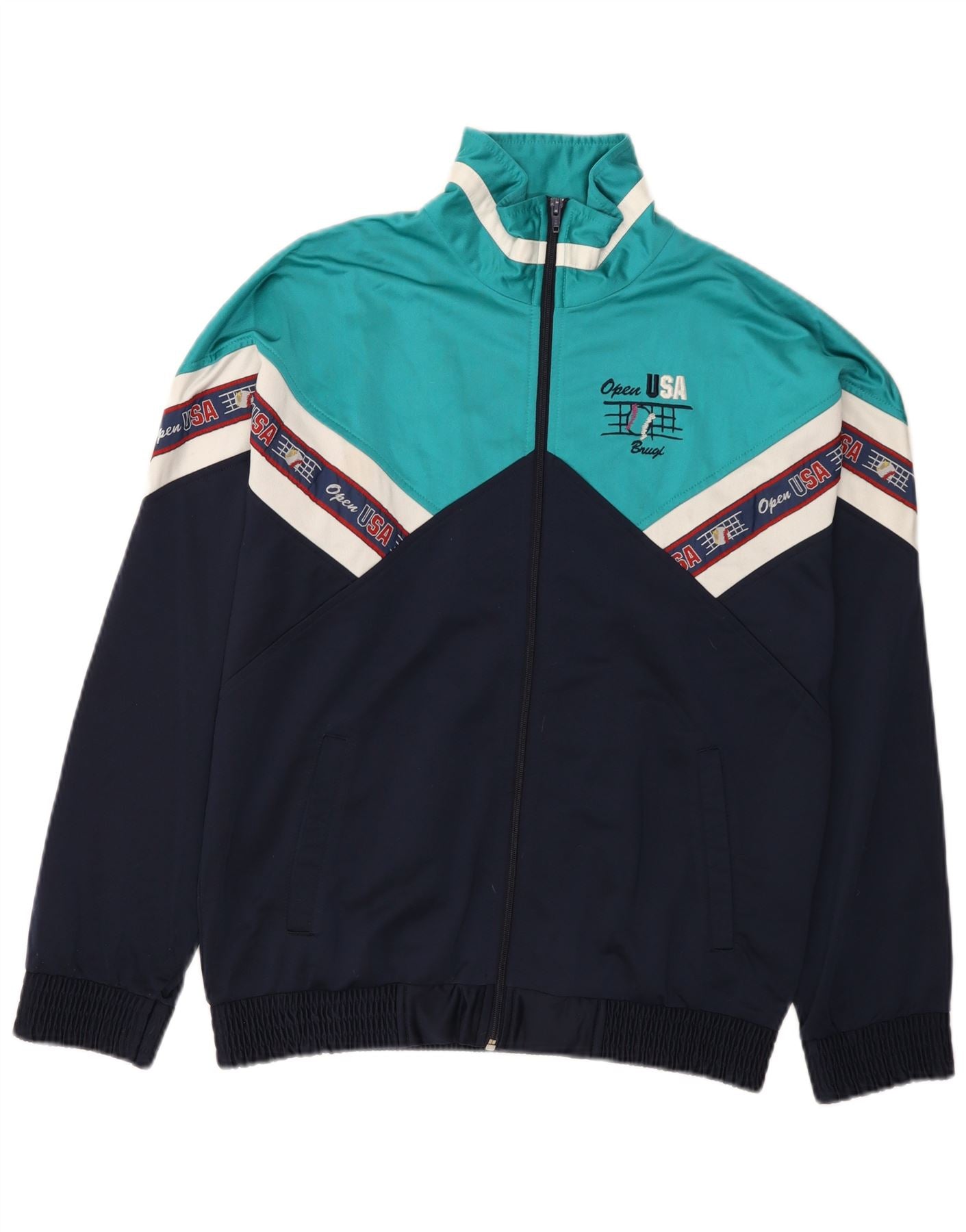- AI opis: Ova Brugi muška gornja jakna trenirke izrađena je od glatkog žerseja od 100 posto poliestera. Ima visoki ovratnik i potpuni patentni zatvarač. Dizajn blokova boja kombinira tamnoplave, tirkizne i bijele akcente. Dugi rukavi završavaju zapešćima s manžetama. Grafički detalj 'Open USA' i logotip dodaju retro štih. Ima udoban regularni kroj i praktične džepove.