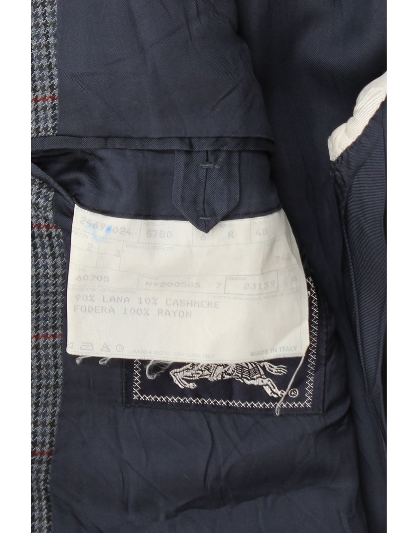 - AI opis: Ovaj Burberrysov muški sako izrađen je od luksuzne tamnoplave miješane tkanine koja sadrži 90 posto vune i 10 posto kašmira. Prikazuje profinjeni karirani uzorak za klasičnu privlačnost. Izrez s ovratnikom i kopčanje s dva gumba definiraju njegovu strukturiranu siluetu. Dugi rukavi i klasični kroj osiguravaju bezvremensku eleganciju. Potpuno je podstavljen i uključuje praktične džepove, nudeći stil i funkcionalnost.
