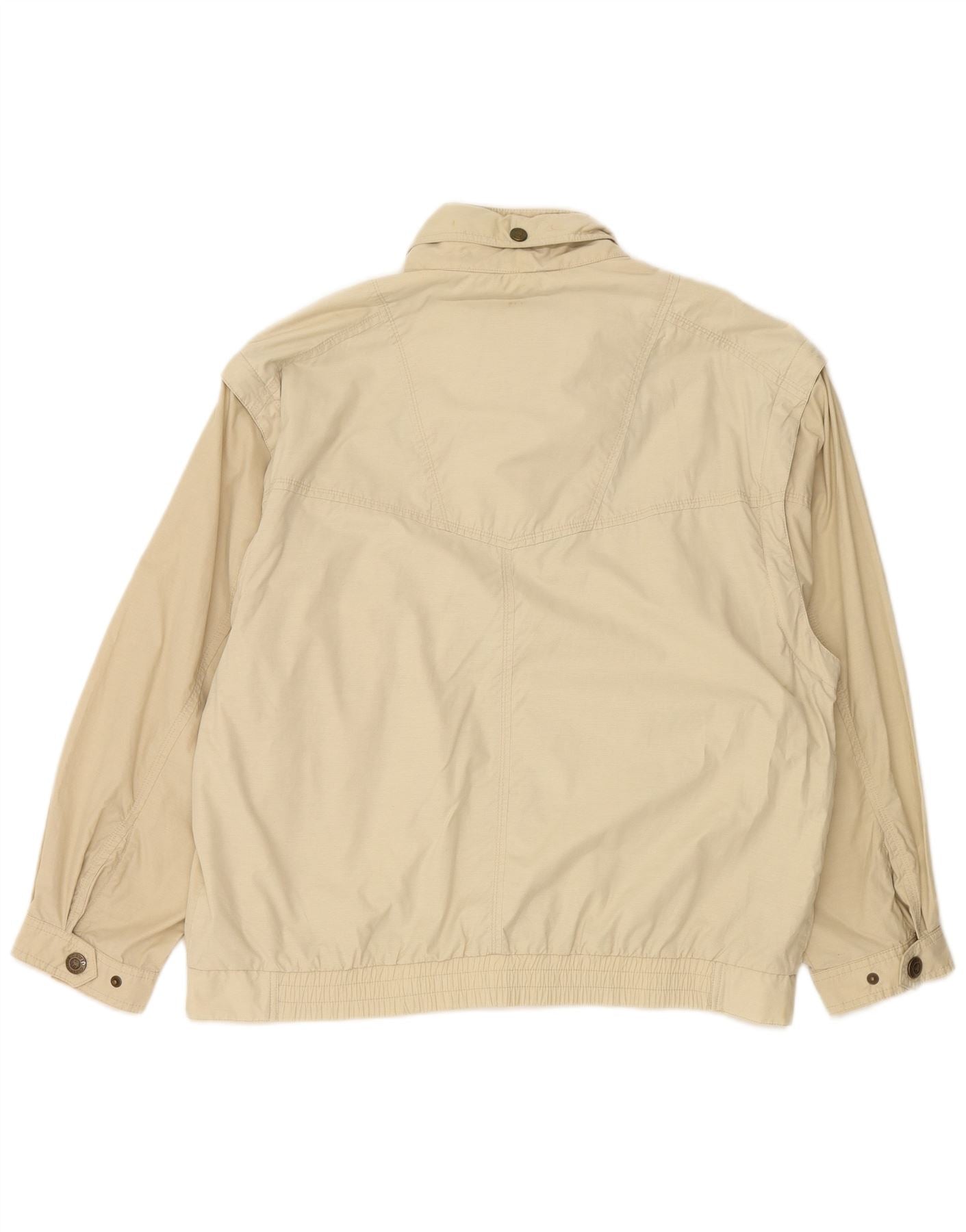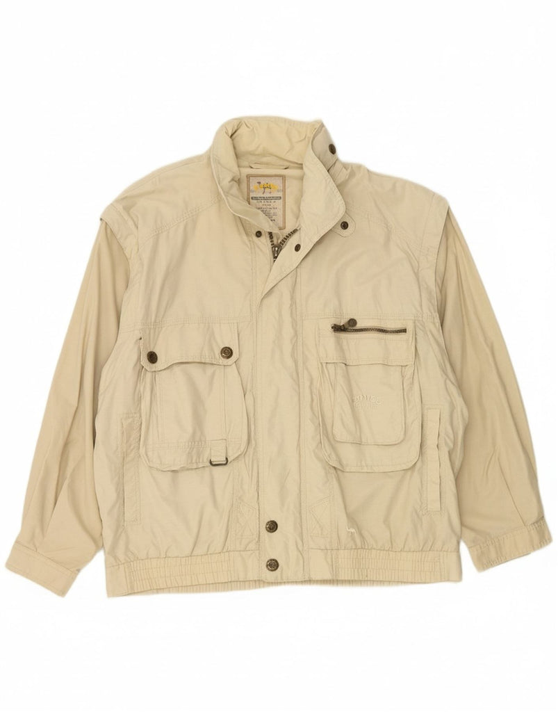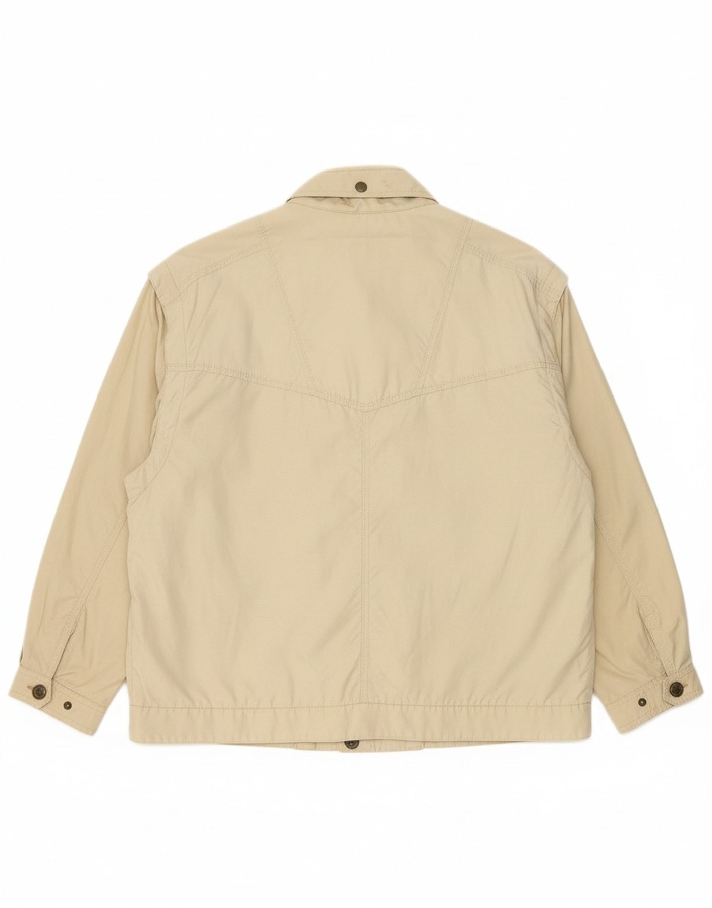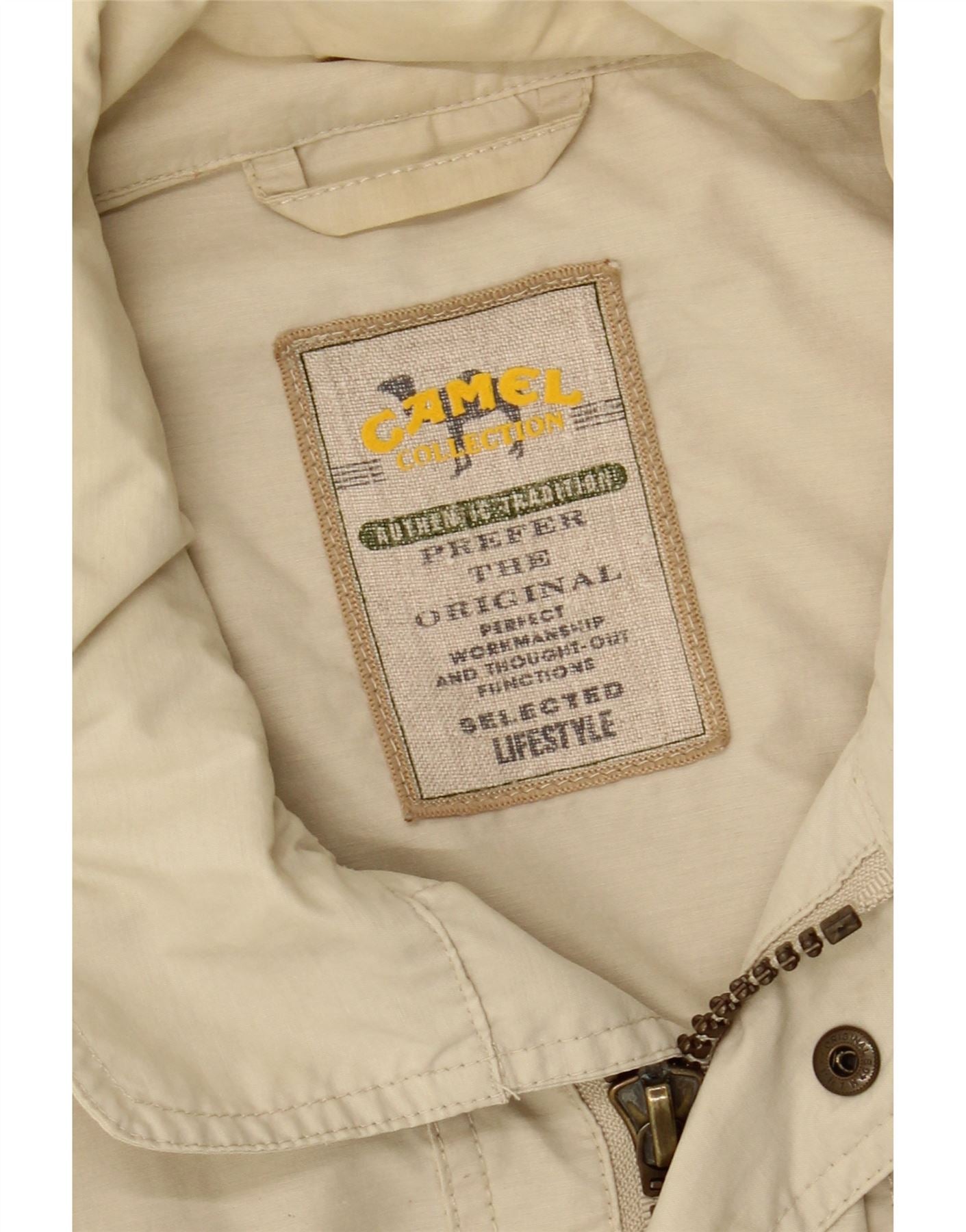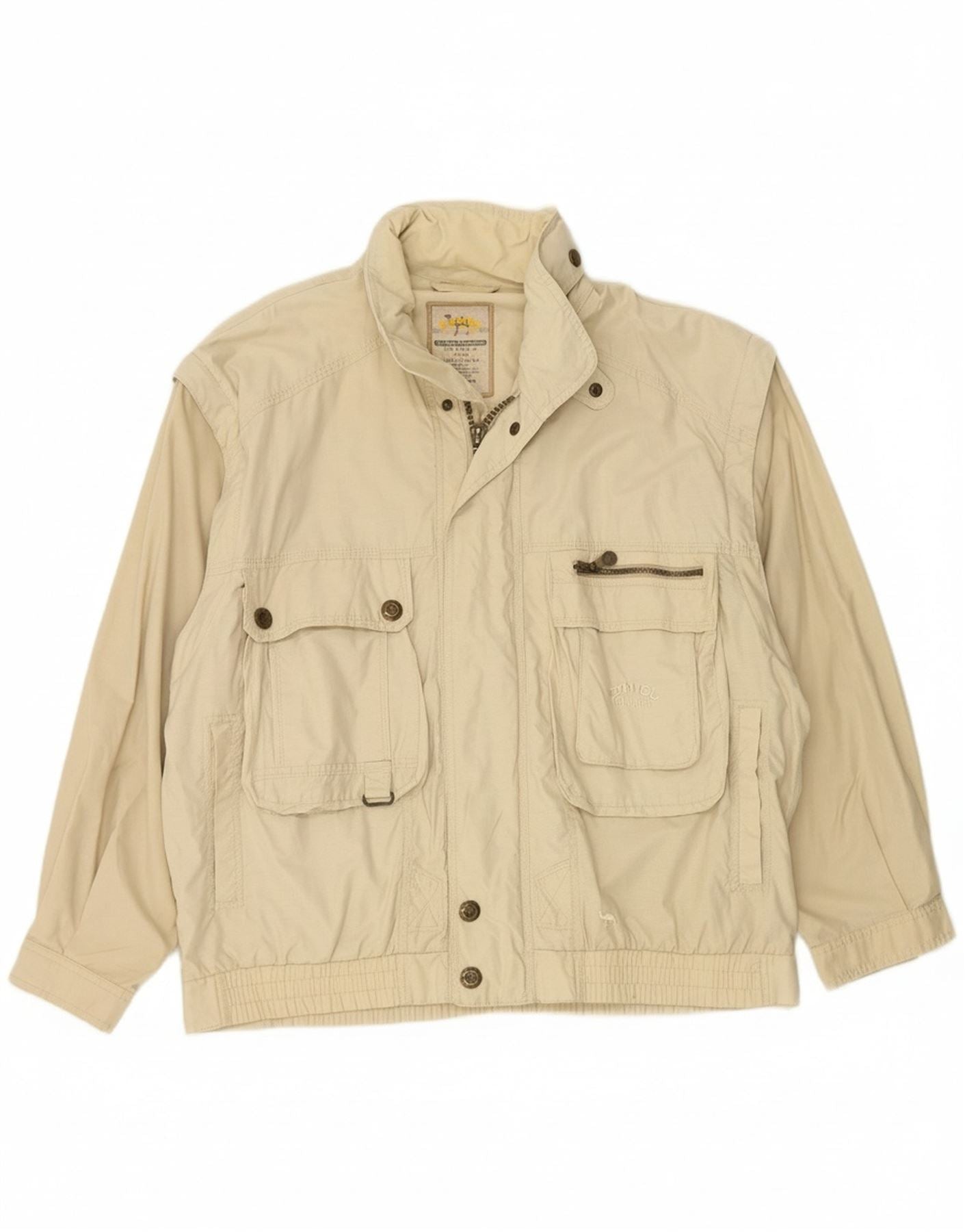 - AI Description: This Camel mens utility jacket is crafted from a lightweight woven fabric, presented in a versatile beige hue. It features a classic collared neckline and long sleeves. A full zip closure runs down the front. Multiple practical pockets enhance its utility design. The regular fit ensures comfortable wear, with subtle button accents adding a refined touch.