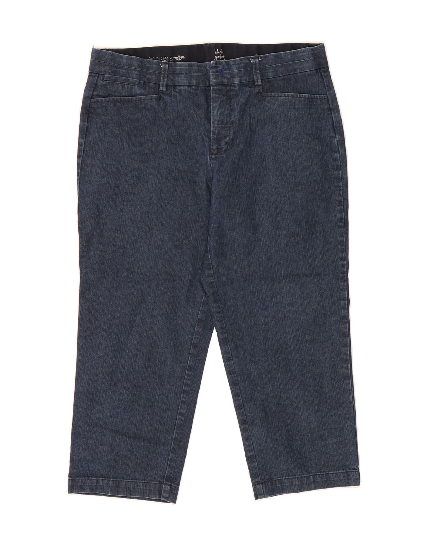 - AI Description: These pre-owned Dockers capri trousers for women are in excellent condition. The blue denim-style trousers are made from a comfortable stretch polyester blend (76% polyester). They feature a regular fit, pull-on closure, elastic waist and handy pockets. Minor loose stitching is present at the waistband and label. Size US 8. These trousers are perfect for everyday wear.
