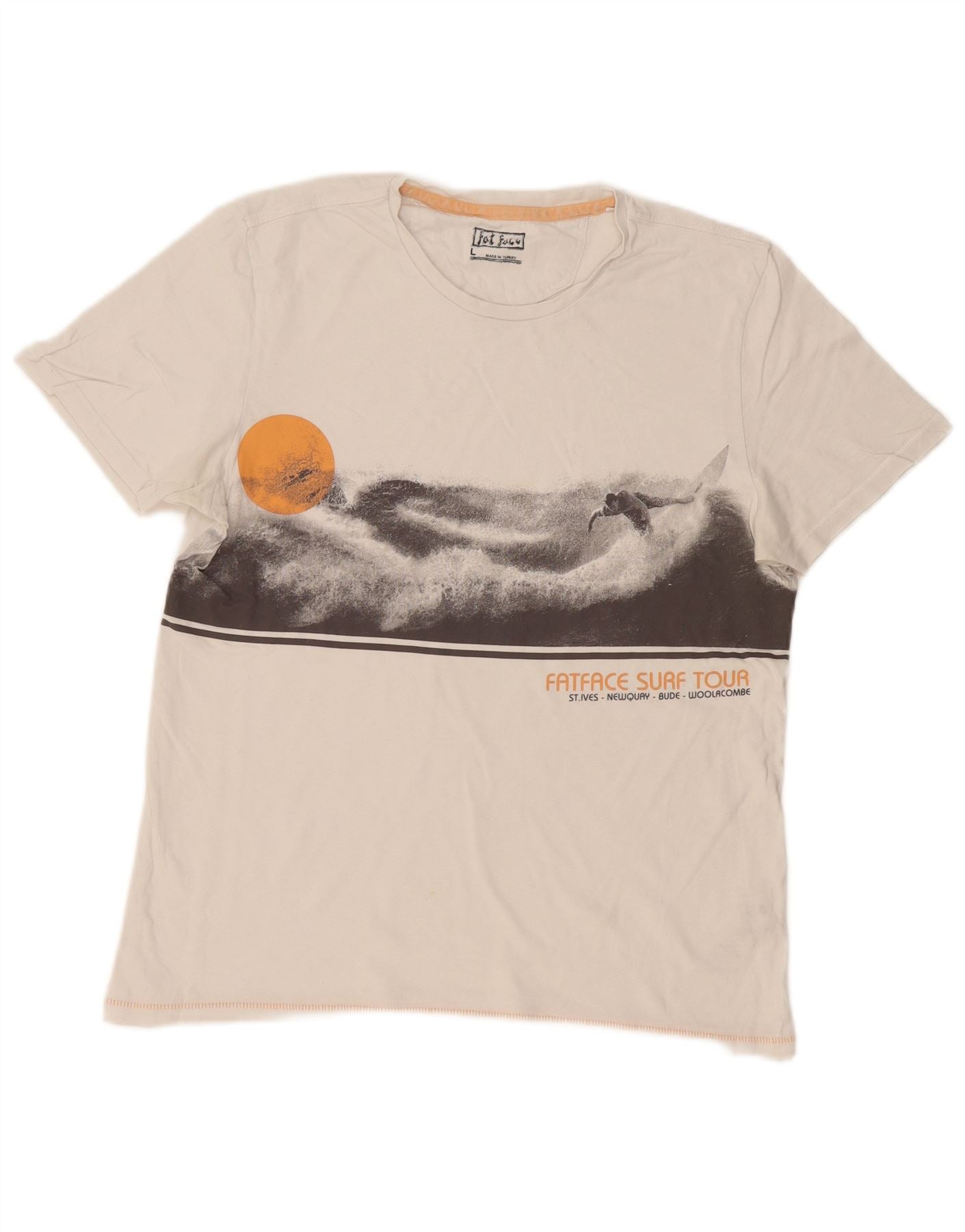 - AI opis: Ovaj Fat Face muški gornji dio majice s grafičkim motivima izrađen je od mekog pamučnog žerseja prljavo bijele boje. Ima klasični okrugli ovratnik i kratke rukave za udobno uobičajeno krojenje. Prednja strana prikazuje prepoznatljivu ilustraciju surfanja s narančastim suncem i tamnim valovima. Ovaj gornji dio pulovera nudi opuštenu siluetu, savršenu za ležerno nošenje. Suptilni logotip Fat Face dodaje notu prepoznatljivosti.