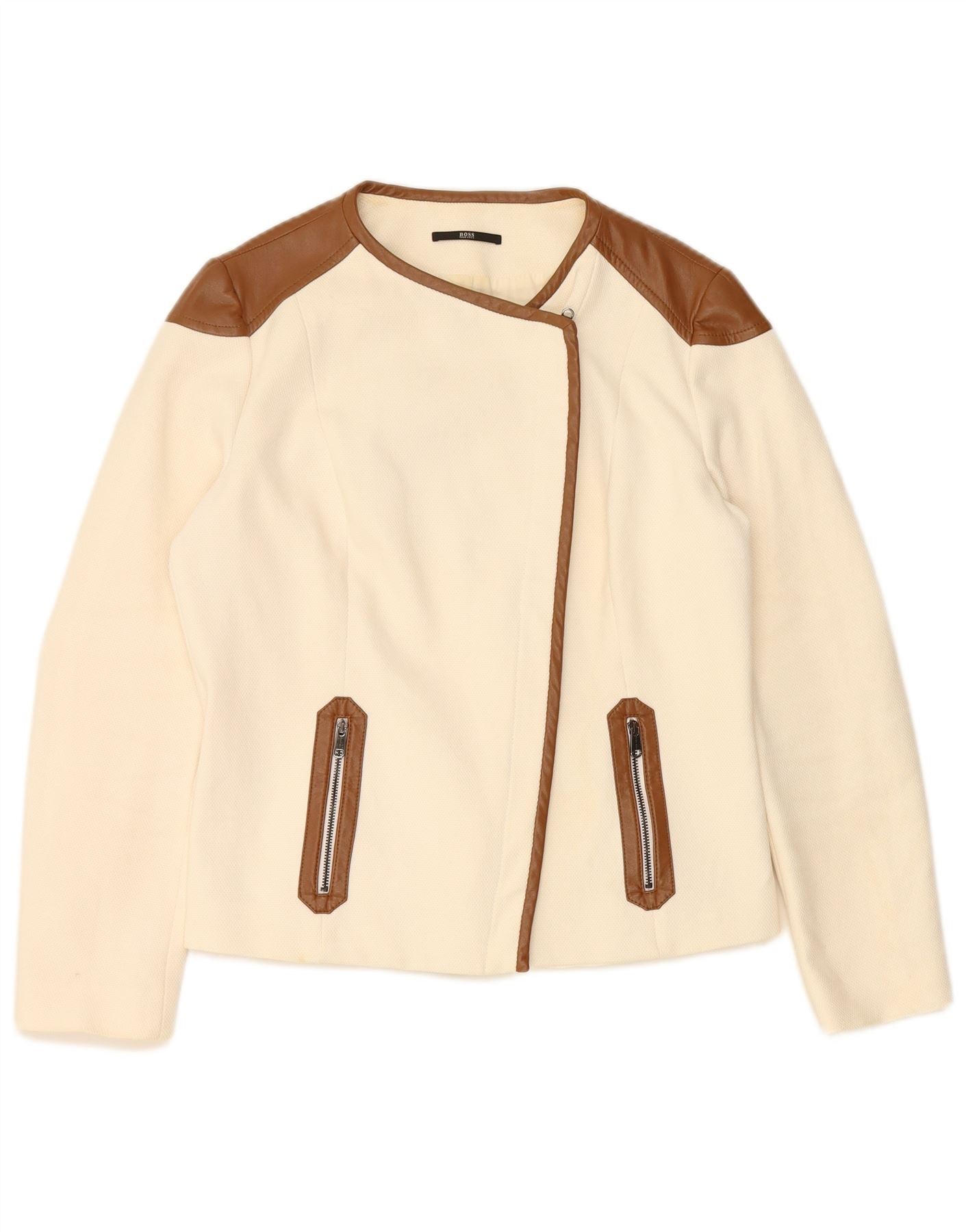 HUGO BOSS Womens Blazer Jacket UK 14 Large Off White Colourblock Cotton