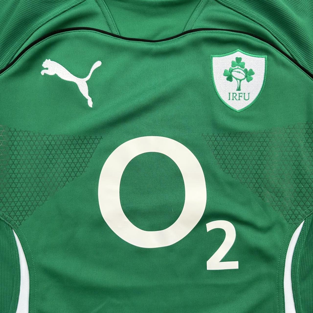 Klasična irska majica za ragbi od pume u zelenoj i bijeloj boji s izvezenim logotipom i O2 sponzorom na prsima. potpuno nove etikete, nikada nošene