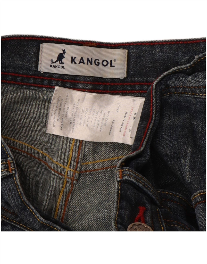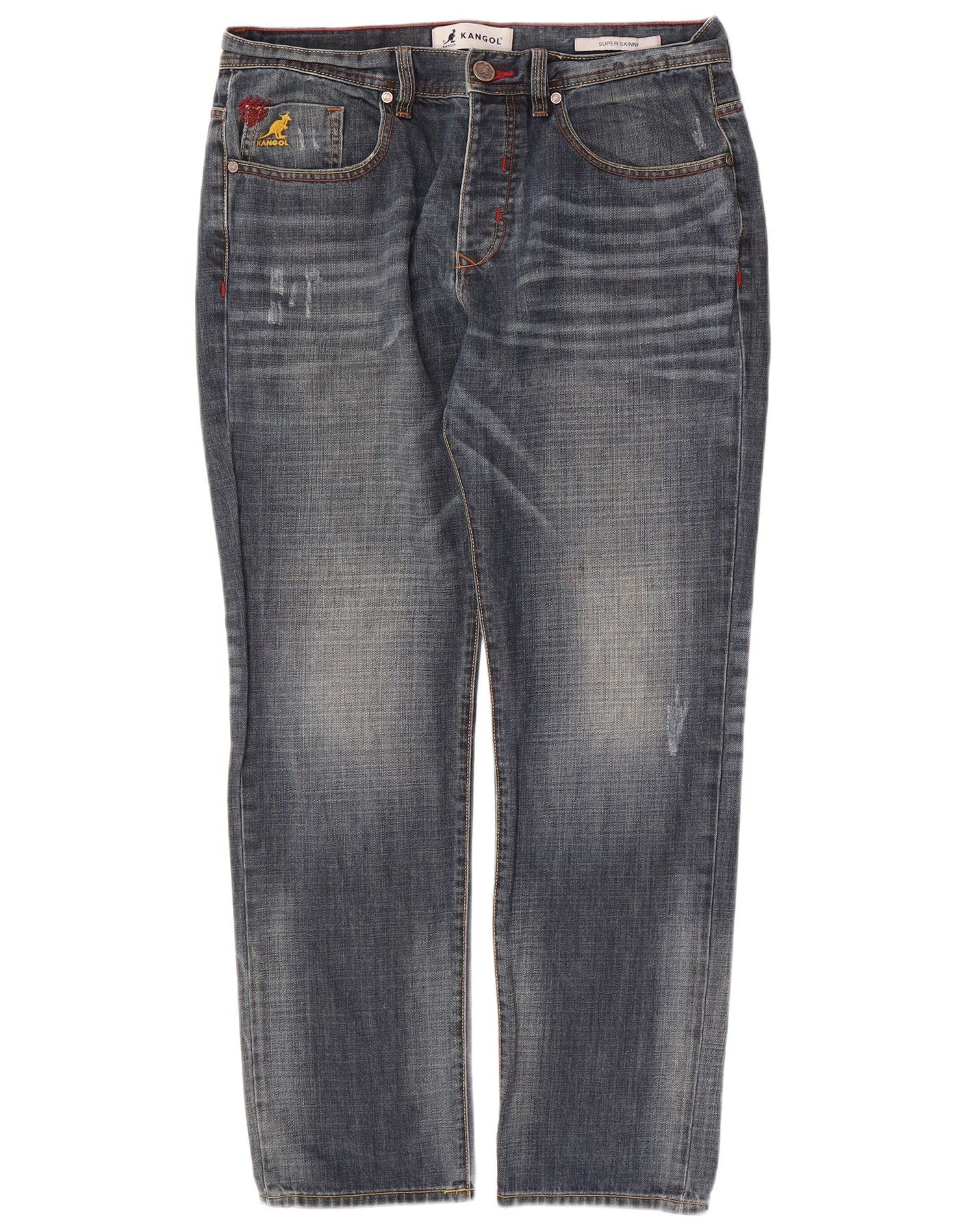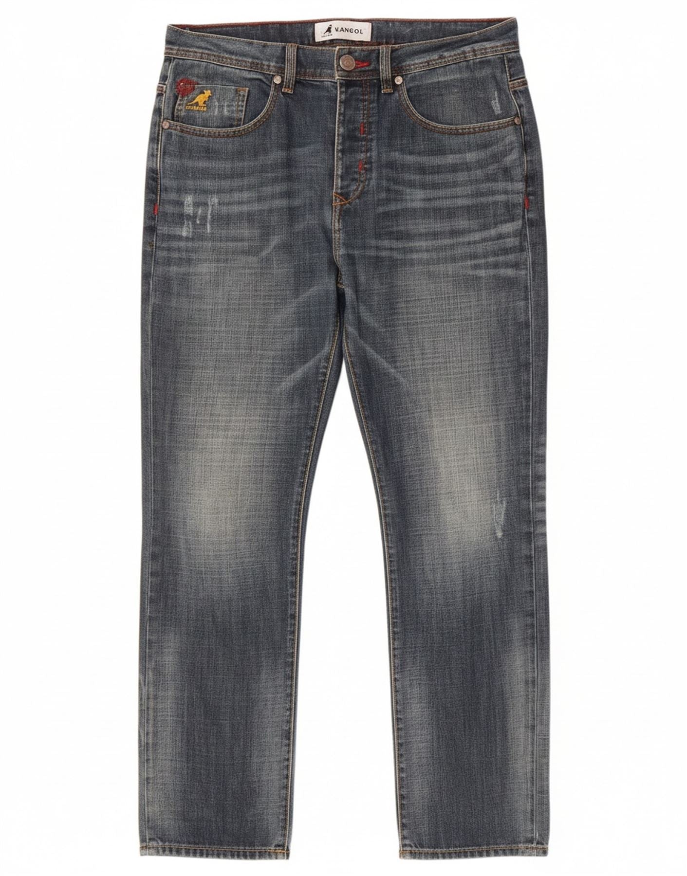 - AI Description: These Kangol mens straight jeans are crafted from blue cotton denim. The fabric features a distressed finish for a worn-in look. They offer a regular fit through the leg. A button closure secures the waist. Classic pockets provide practicality. A subtle logo accent adds brand recognition. These jeans combine comfort with a contemporary, casual style.