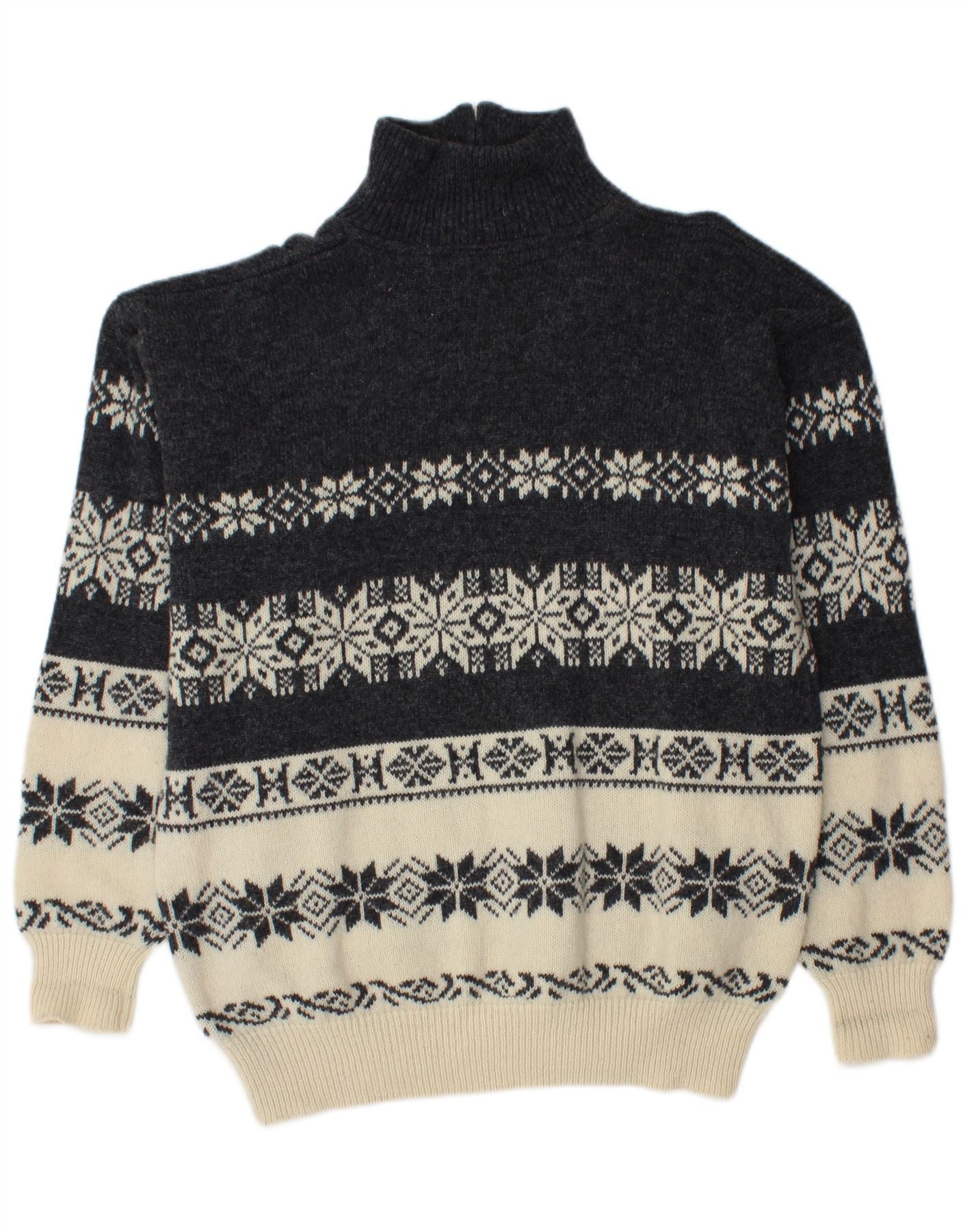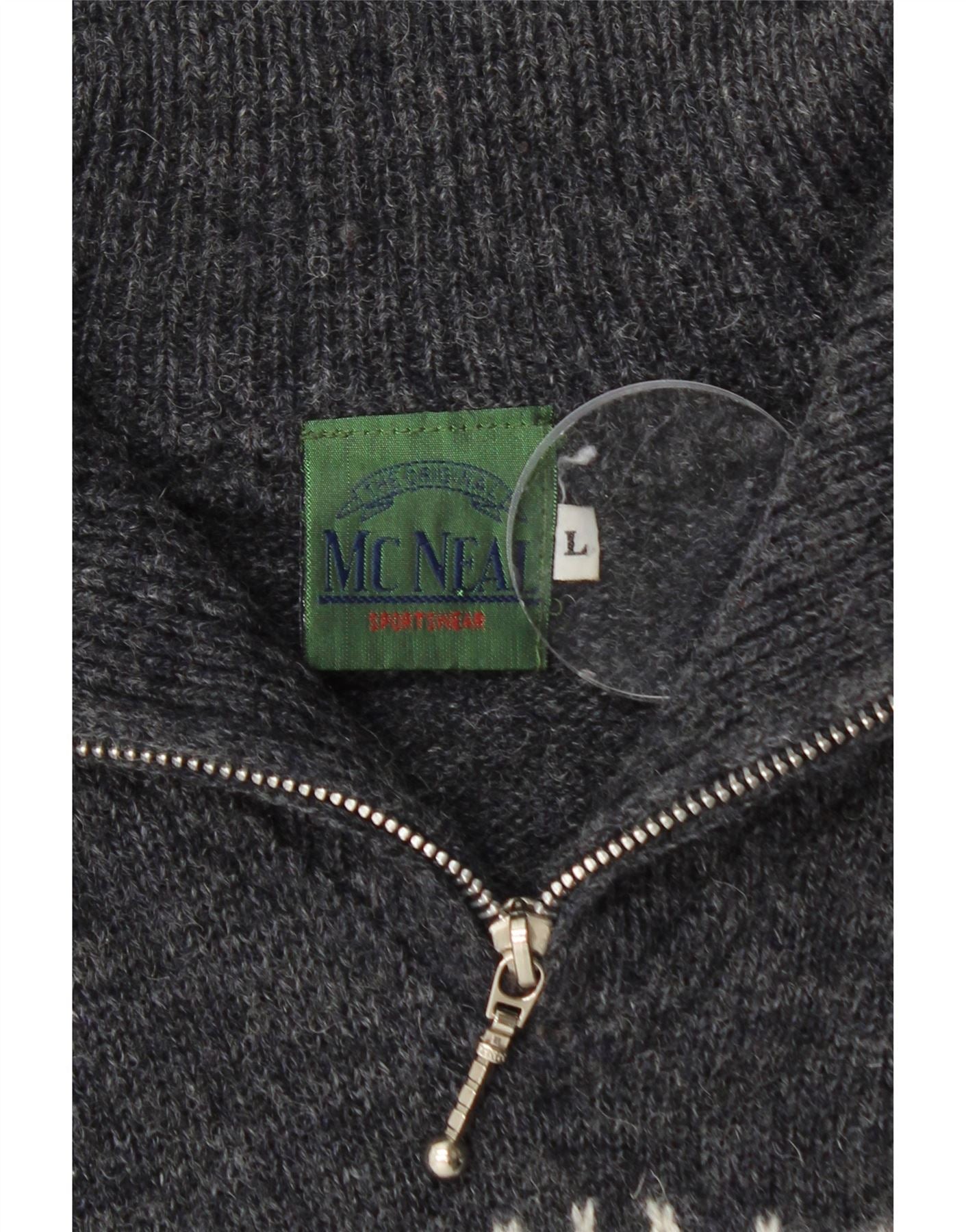 MC NEAL Mens Graphic Zip Neck Jumper Sweater Large Grey Fair Isle Wool