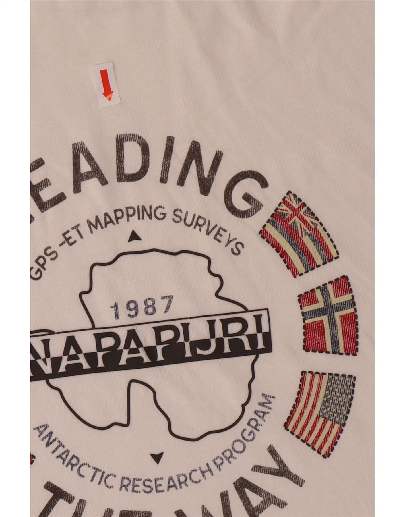 - AI opis: This Napapijri mens Graphic T-Shirt Top is crafted from a soft off white cotton blend knit. Ima klasični okrugli izrez i kratke rukave za svakodnevnu udobnost. Pravilan kroj osigurava opuštenu siluetu. A distinctive graphic print adorns the front, showcasing the brands Antarctic Research Program theme with flags and text. This pullover top offers lightweight wear and stretch for ease of movement.