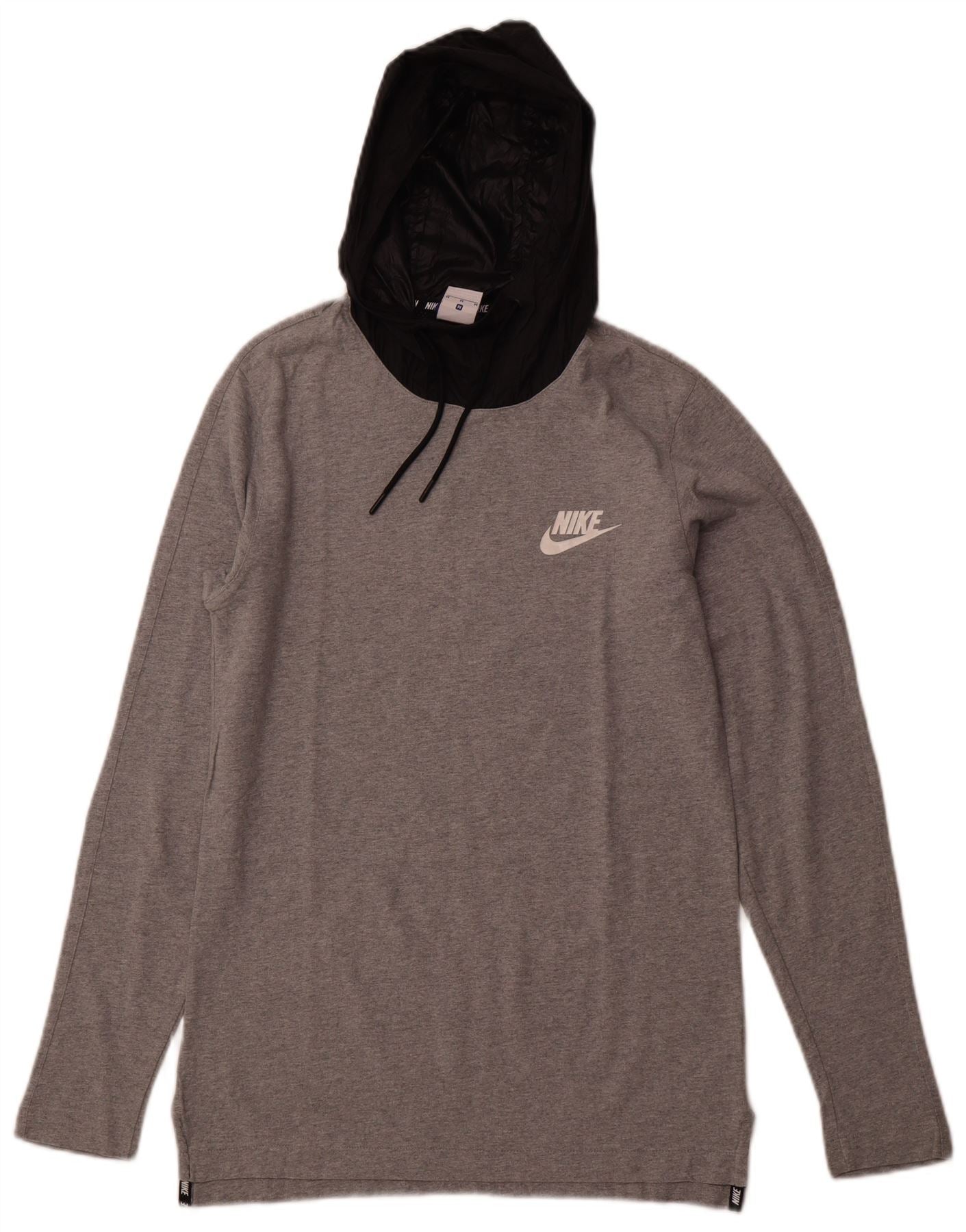 - AI Description: This Nike mens hoodie jumper is crafted from a soft grey cotton knit. It features a comfortable regular fit and a classic pullover design. The hooded neckline includes a polyester overlay for added structure. Long sleeves and a round neck complete the athletic silhouette. A prominent graphic logo provides a signature branded detail.