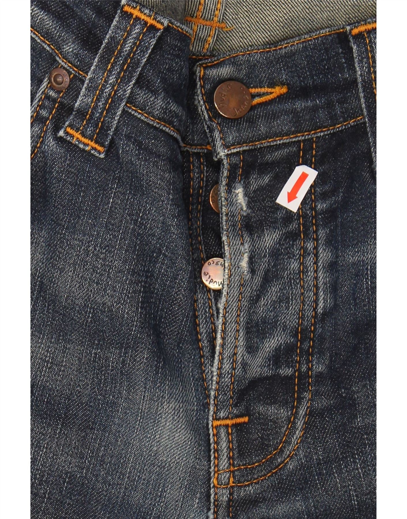 - AI Description: This Nudie Jeans mens straight jeans are crafted from durable blue denim, offering a classic aesthetic. They feature a straight leg and a regular fit, ensuring comfortable, timeless wear. The button closure and fly provide a secure and traditional fastening. Practical pockets are included for everyday utility. This versatile pair embodies a classic style, perfect for various casual ensembles.