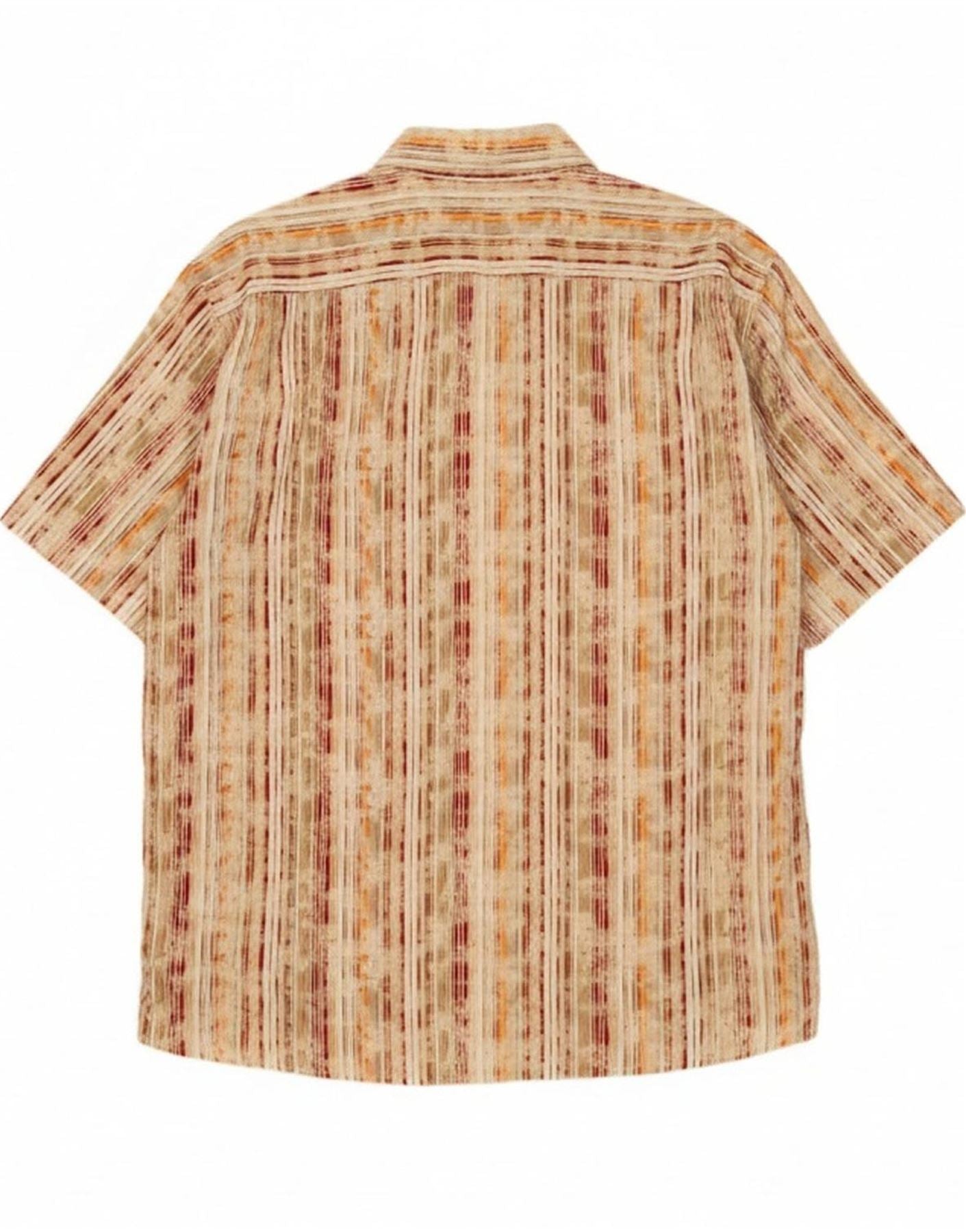 AI Description: This Vintage mens shirt is crafted from a multicoloured woven fabric. It features a collared neckline and a full button-up front. Short sleeves and a regular fit offer a comfortable silhouette. The retro design is enhanced by its bold abstract striped pattern, creating a distinctive look. This shirt provides a relaxed yet stylish feel.