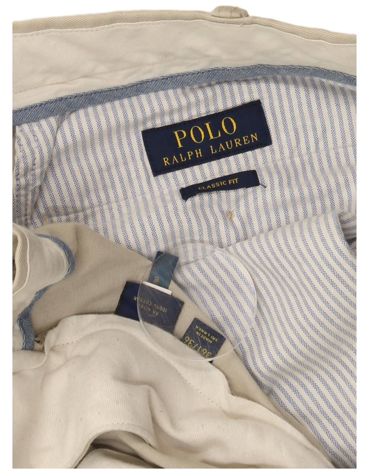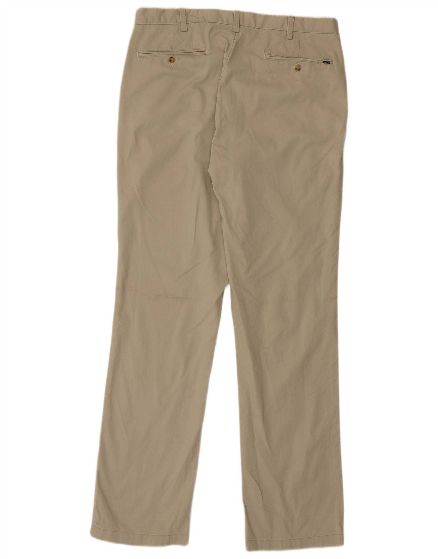 - AI Description: This Ralph Lauren mens Chino Trousers are expertly crafted from 100 percent woven cotton. The beige fabric offers a soft yet durable texture. They feature a classic straight leg and a comfortable classic fit. A button closure ensures a secure fastening. Practical pockets add functional detail, completing this versatile design.
