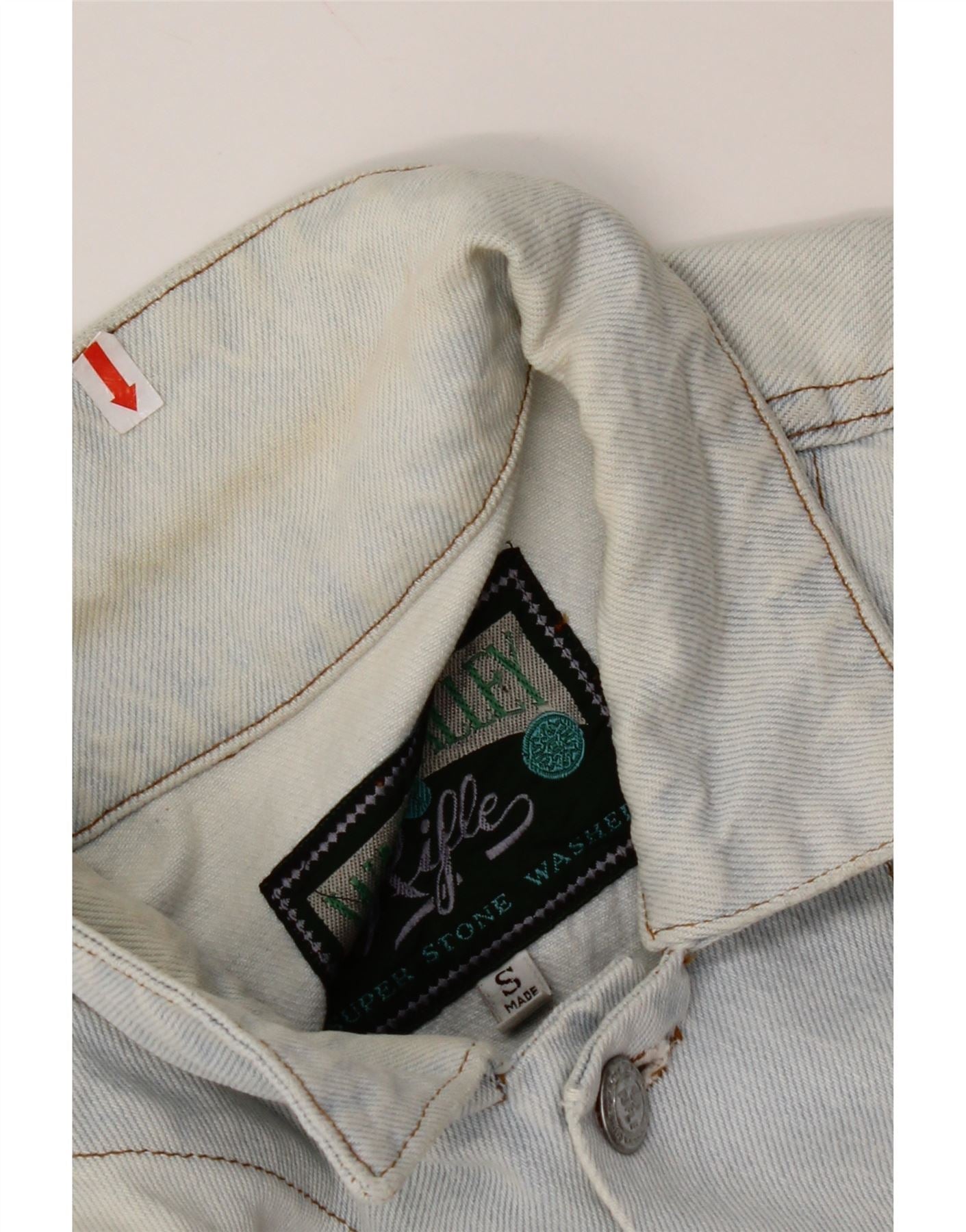Stanje: Pošteno korišteno stanje: predmet je često nošen i može imati brojne nedostatke - oznaka na rukavu i leđima. Oznaka na ovratniku.isprana boja.materijal traperica.