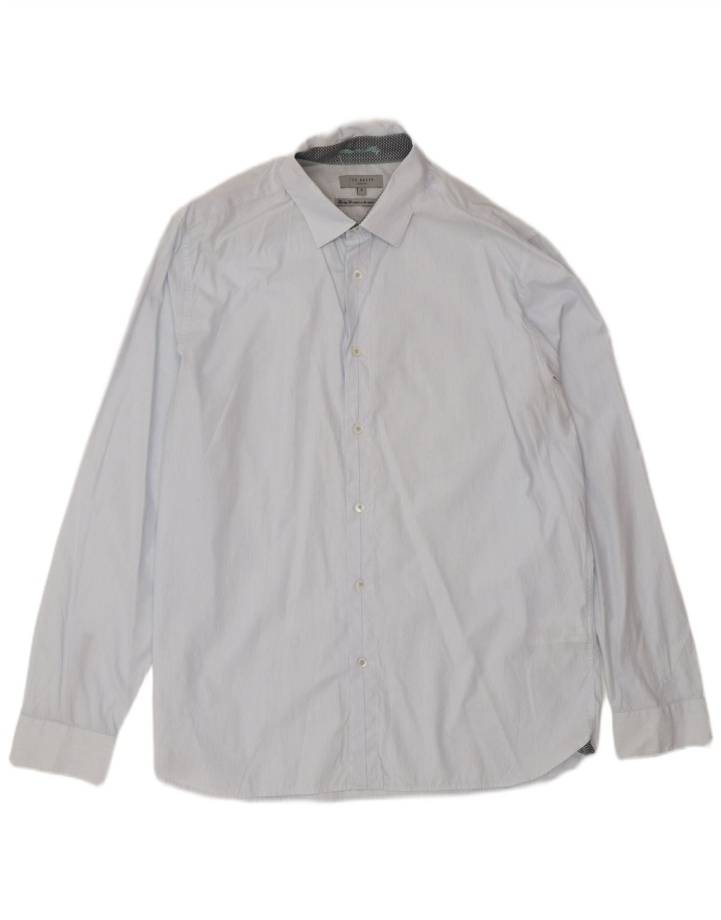 - AI opis: Ova Ted Baker muška košulja izrađena je od 100 posto pamučne tkanine. Ima suptilan plavi prugasti uzorak. Izrez s ovratnikom i kopčanje sprijeda nude klasičan izgled. Dugi rukavi završavaju s manšetama na gumbe. Pravilan kroj osigurava udobno nošenje. Unutarnji detalji ovratnika dodaju prepoznatljiv dodir. Ova košulja kombinira bezvremenski stil s profinjenom udobnošću za svaku priliku.