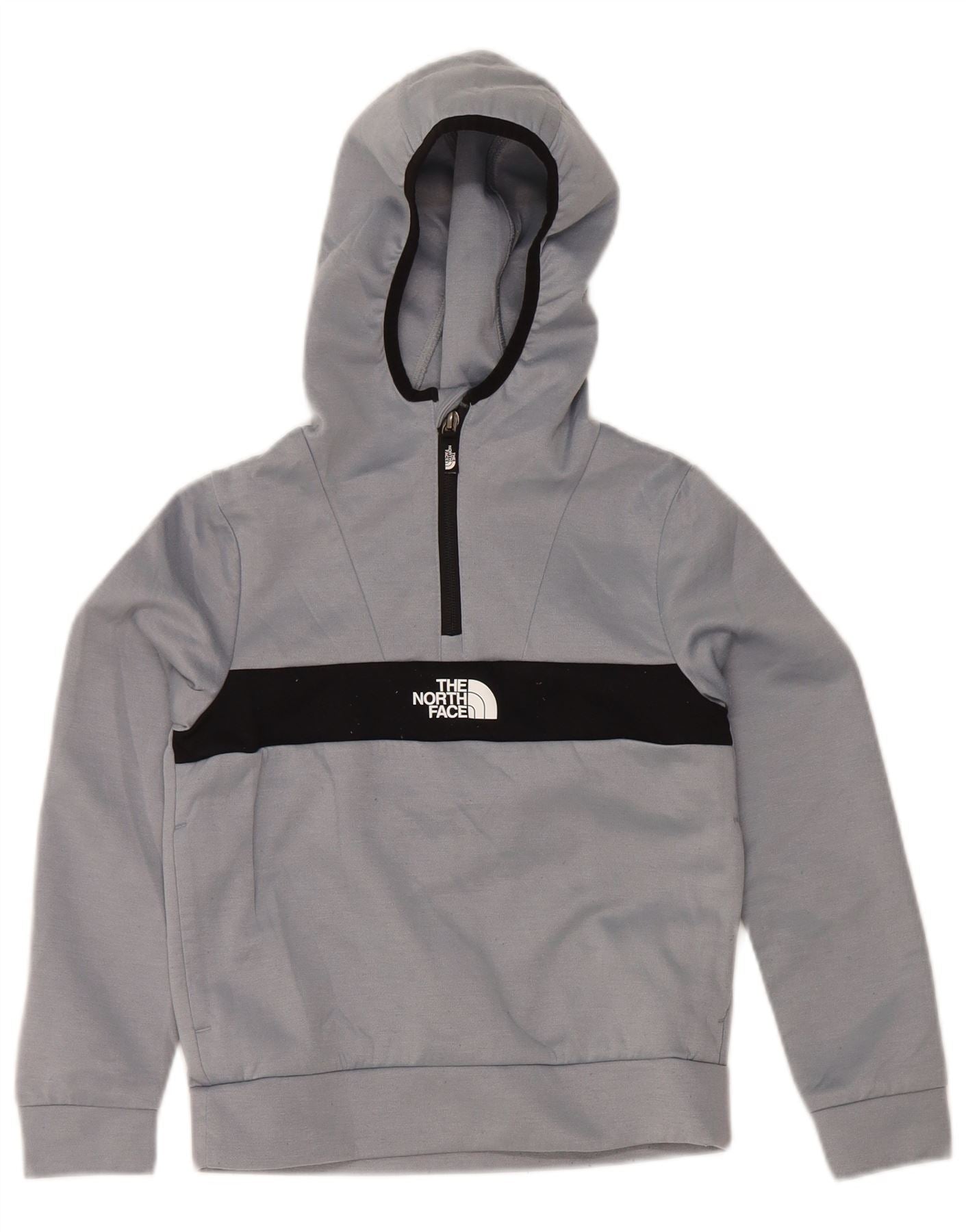 - AI Description: This The North Face boys hoodie jumper is crafted from a blue knit fabric, offering a comfortable stretch. It features a regular fit and long sleeves. The hooded design provides extra warmth. A 1/4 zip closure at the round neck allows for adjustable ventilation. A prominent logo accent adds signature branding. This versatile piece is perfect for everyday wear.