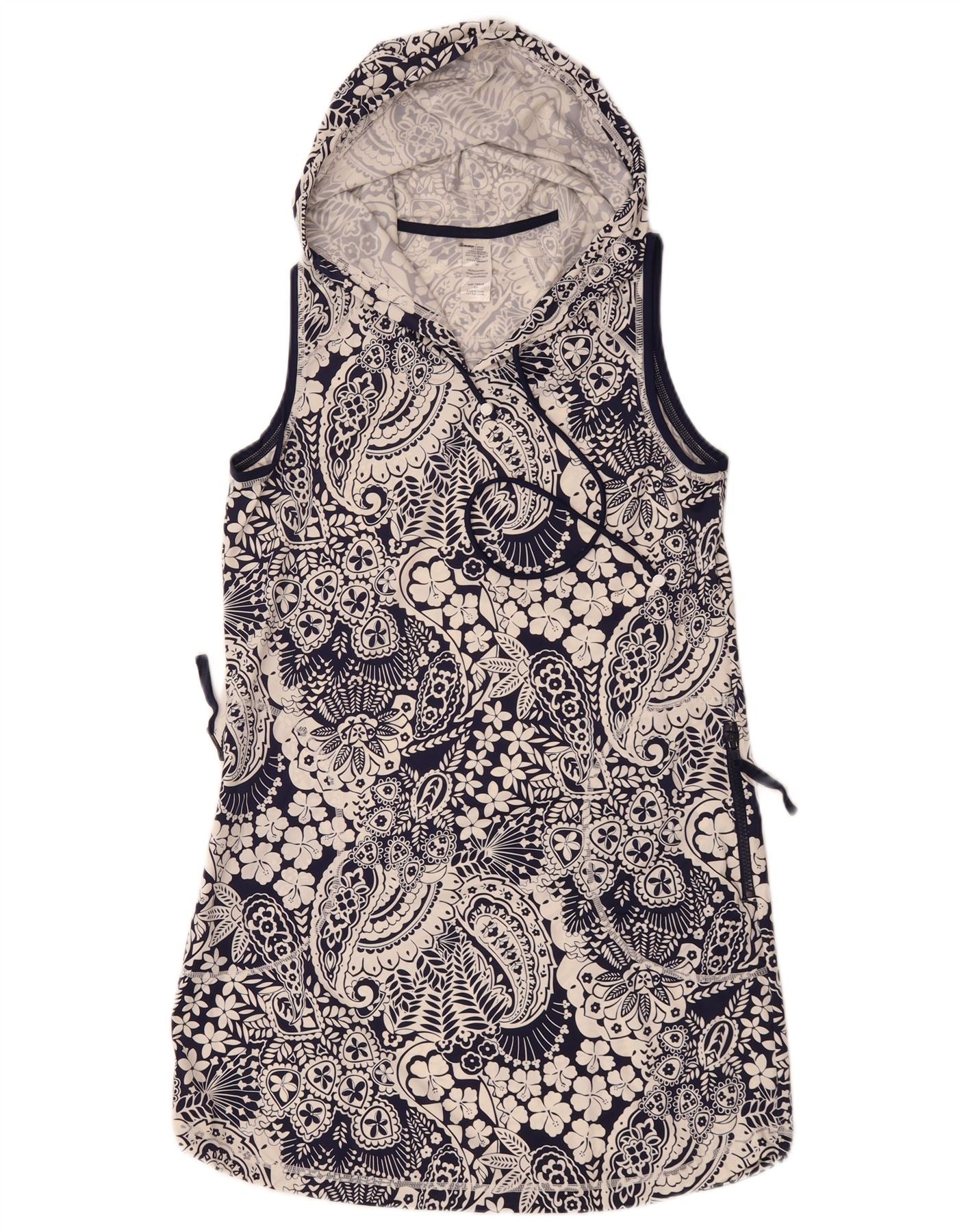 - AI opis: Ova ženska haljina s kapuljačom Tommy Bahama izrađena je od mješavine mekanog poliestera. Odlikuje se živim višebojnim paisley uzorkom, pretežno tamnoplavom i bijelom. Dizajn bez rukava nudi opušteno pristajanje. Uključuje praktičnu kapuljaču i praktične džepove. Stil pulovera osigurava jednostavno nošenje. Ova haljina uobičajenog kroja utjelovljuje boemsku estetiku.