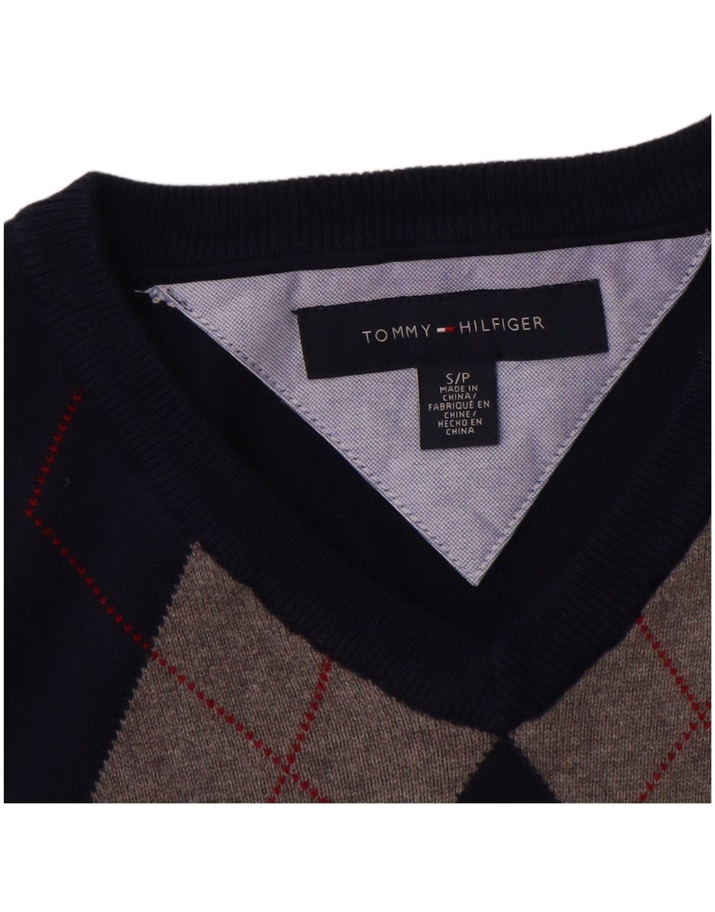 TOMMY HILFIGER Mens V-Neck Jumper Sweater Small Navy Blue Argyle/Diamond