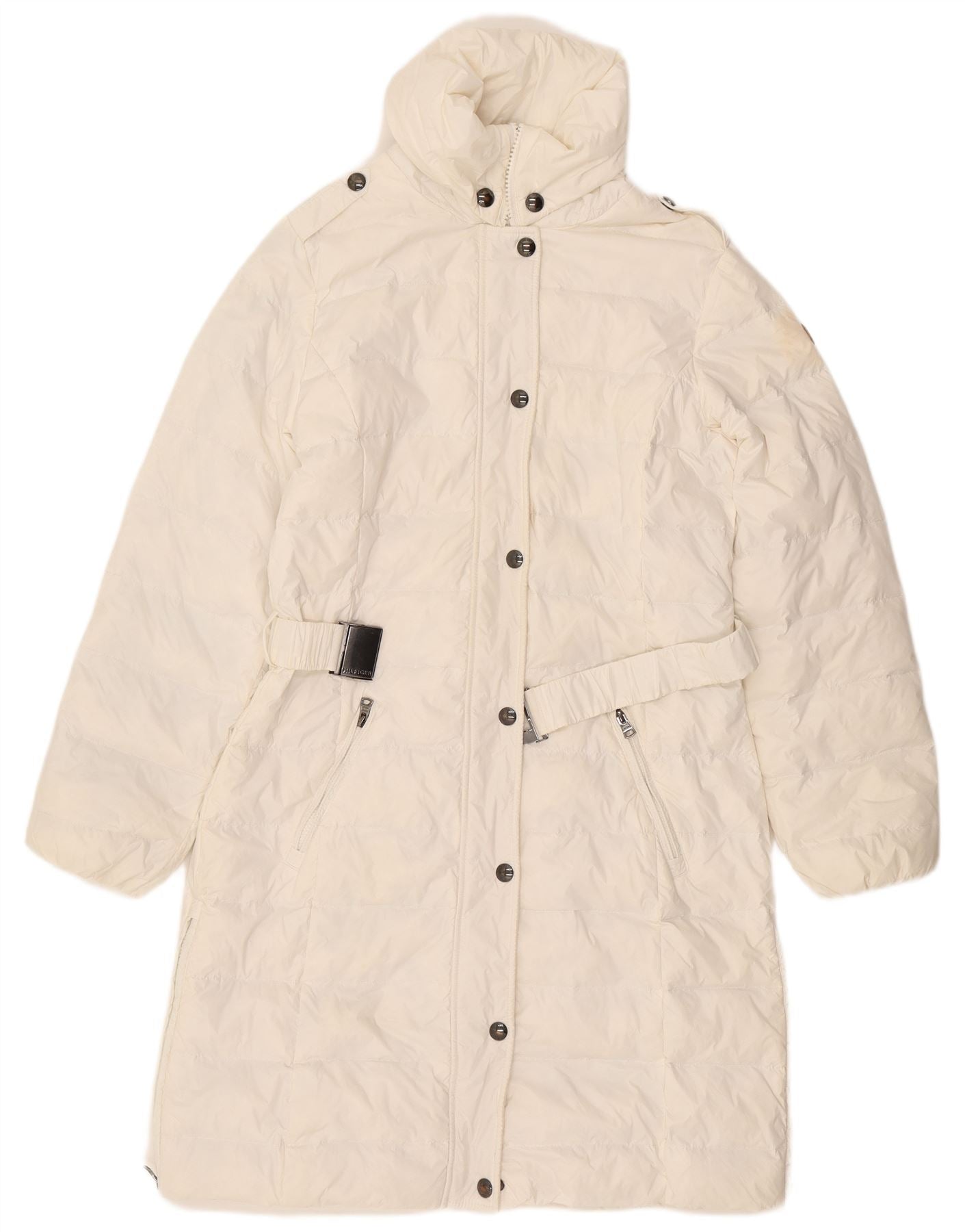 - AI Description: This Tommy Hilfiger womens padded coat is crafted from a down-filled fabric, offering thermal warmth and a soft, padded texture in a sophisticated off-white hue. It features a high neck and long sleeves for ample coverage. A full zip closure is concealed by a button placket. The regular fit ensures comfortable wear. Fully lined, it includes a belted waist with a buckle accent, creating a flattering silhouette.