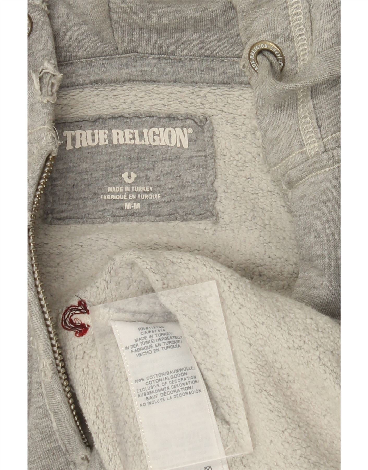 TRUE RELIGION Mens Distressed Zip Hoodie Sweater Medium Grey Cotton