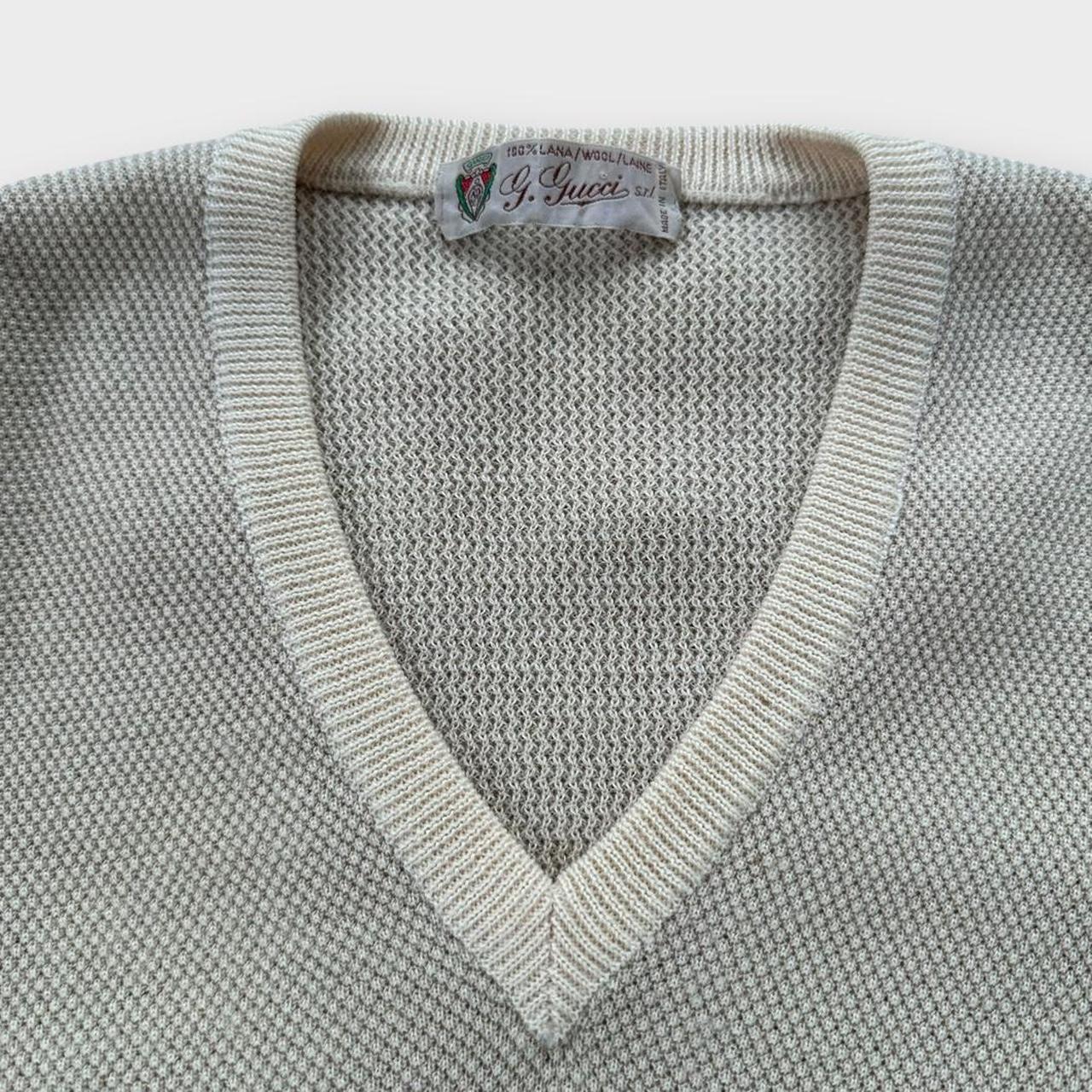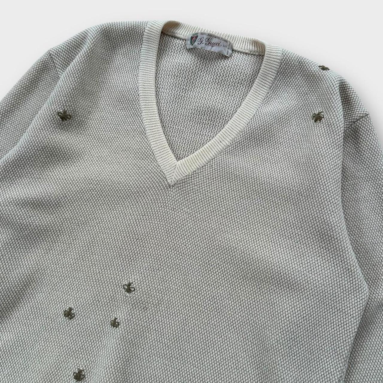 Vintage originalni Gucci pleteni džemper iz 1990-ih u bež boji s izvezenim G i Gucci pčelama prikazan na slikama
