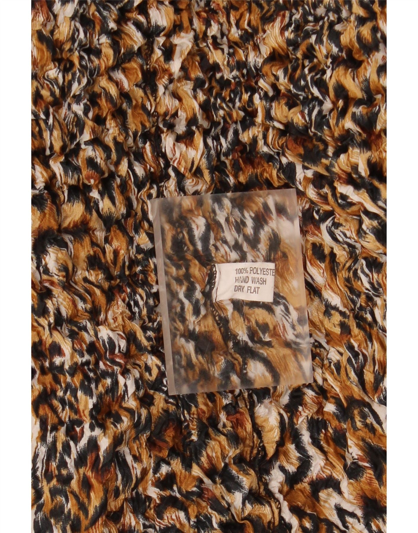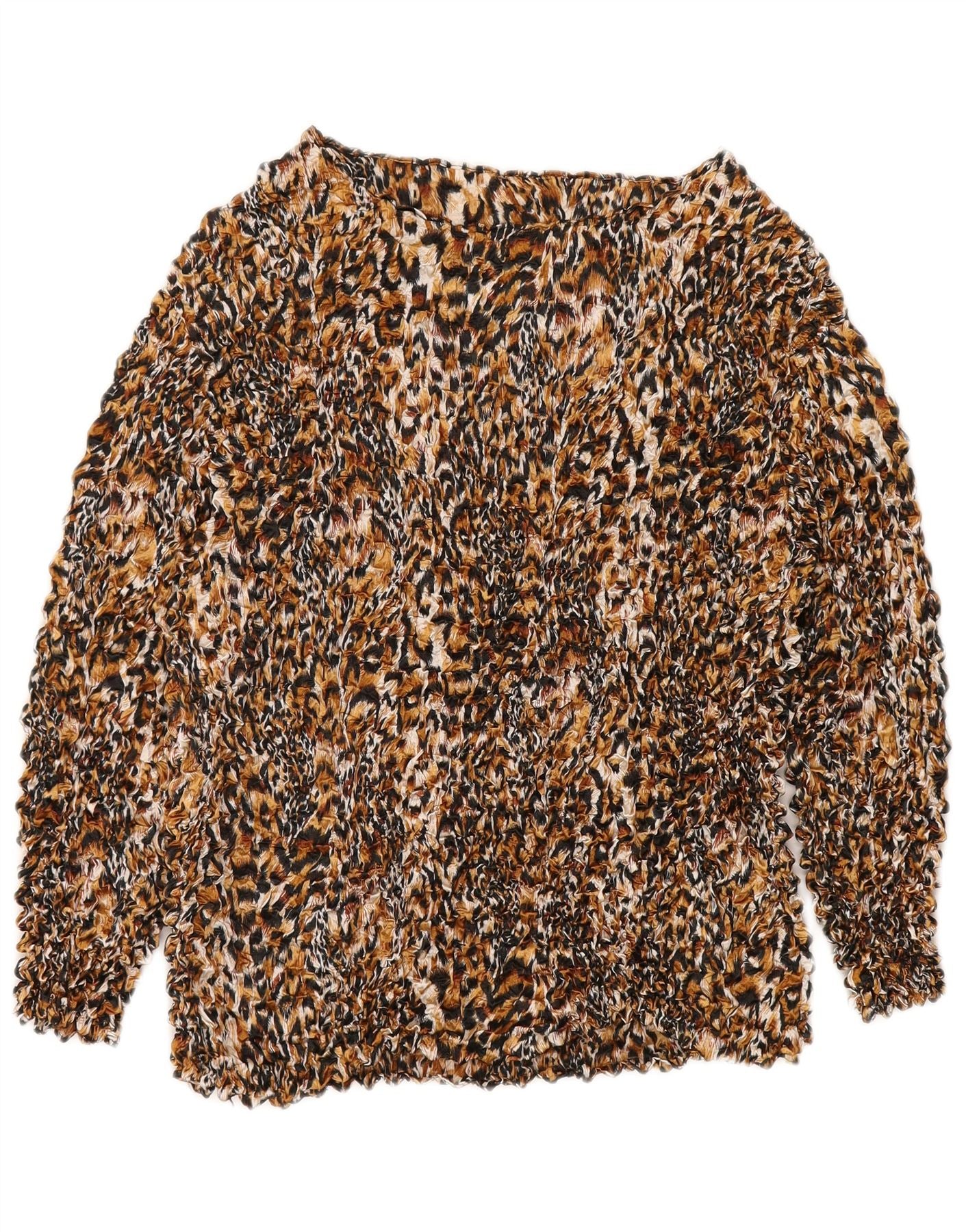 - AI opis: Ovaj starinski gornji dio ženske bluze izrađen je od 100 posto poliestera s prepoznatljivom tkanom, nabranom teksturom. Sadrži živopisni višebojni leopard print koji spaja smeđe, crne i bež tonove. Okrugli izrez i dugi rukavi nude klasičnu siluetu. Dizajniran kao pulover, omogućuje pravilno pristajanje za udobno nošenje. Životinjski uzorak i teksturirana završna obrada stvaraju odvažan, moderan dojam.