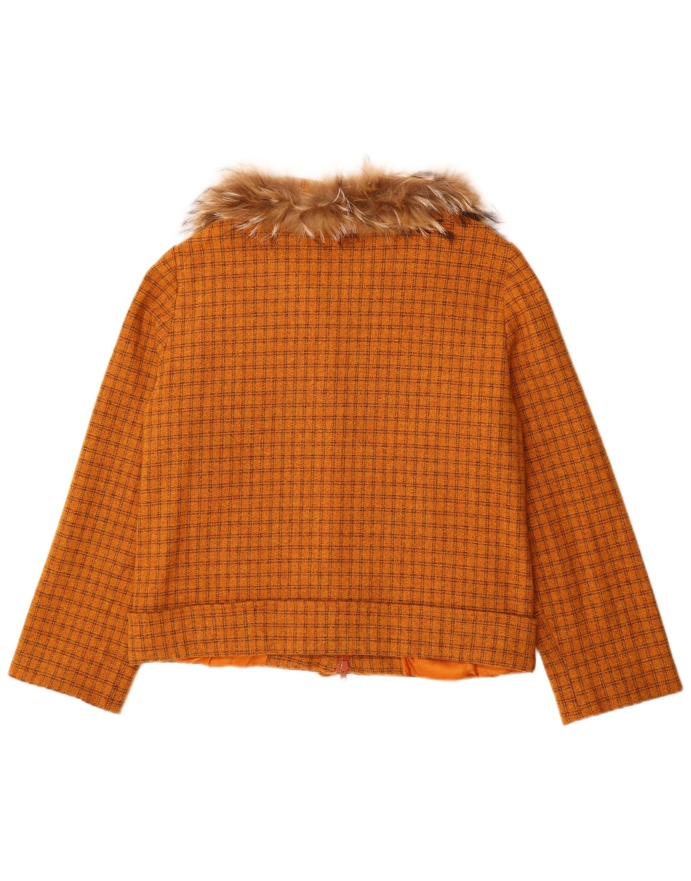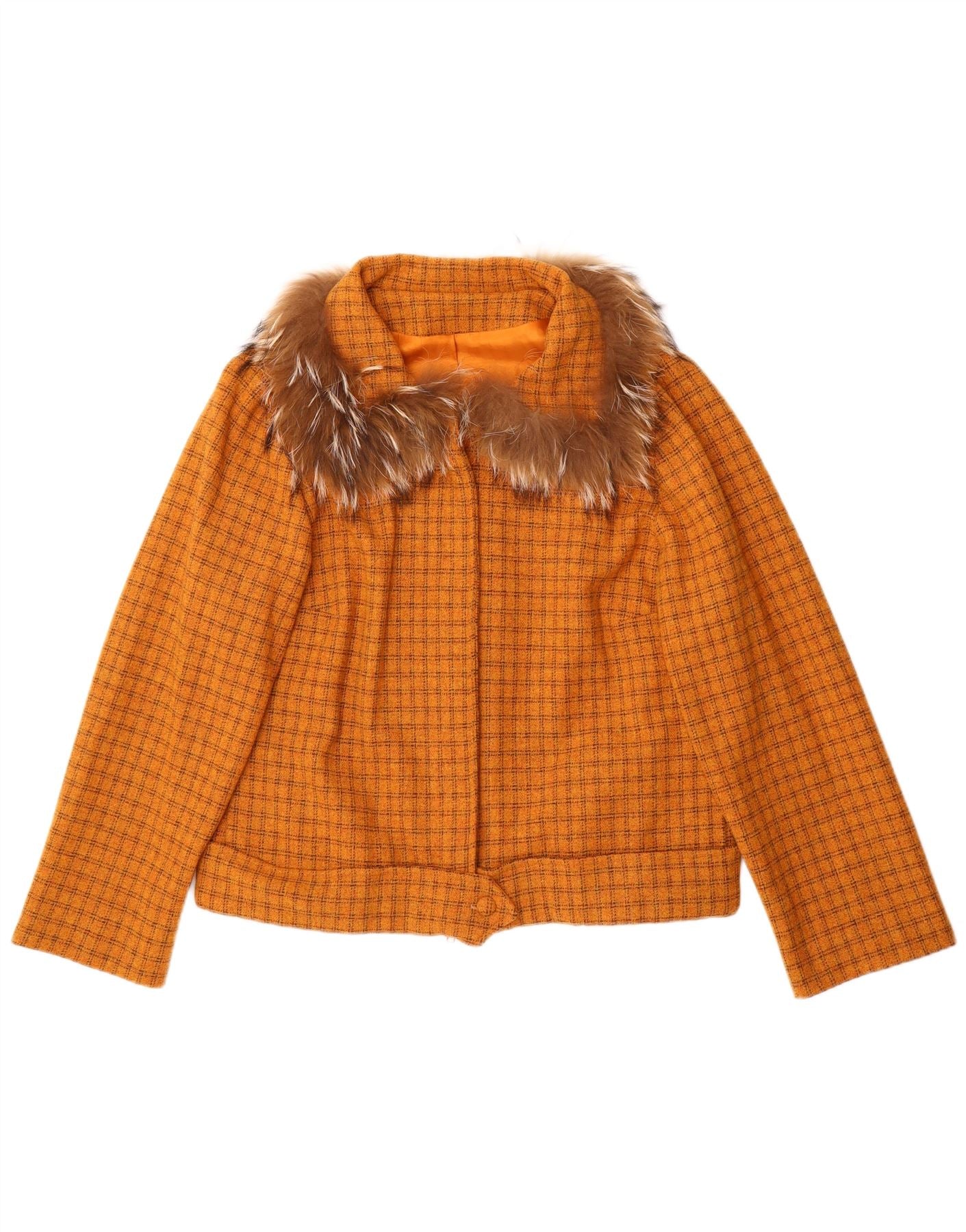 - AI Description: This Vintage womens fur jacket boasts a striking orange check pattern. Its plush, soft texture offers luxurious warmth and tactile appeal. The collared neckline and long sleeves frame a classic silhouette, perfect for cooler weather. A central zip closure secures the regular fit. This lined jacket beautifully blends retro style with a distinctive, eye-catching design.