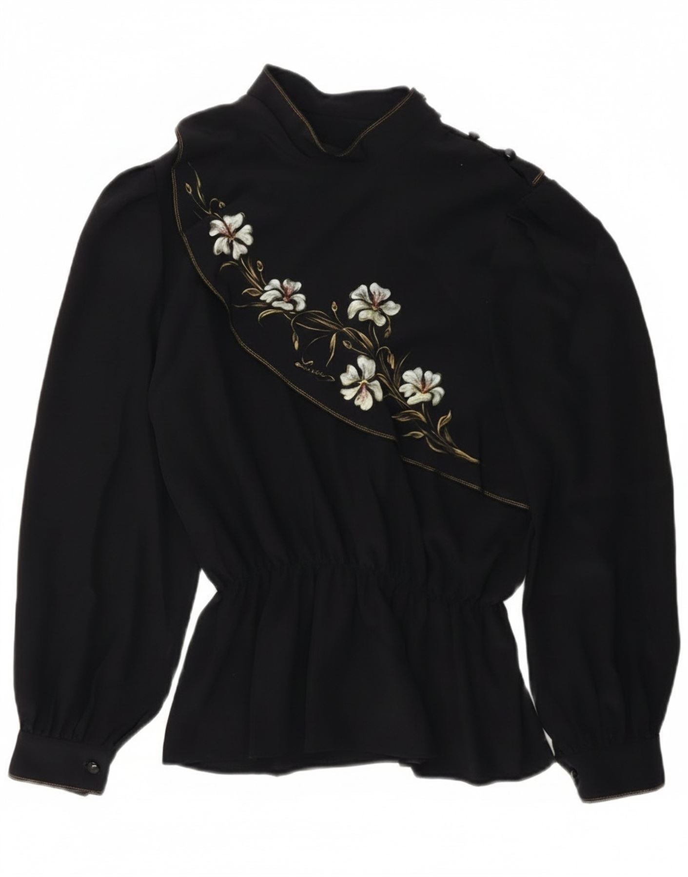 - AI opis: Ovaj starinski gornji dio ženske bluze izrađen je od crnog tkanog materijala. Ima lažni ovratnik i duge rukave s detaljima na manžetama. Opušteni kroj prelazi u peplum porub s elastičnim strukom. Elegantan izvezeni cvjetni uzorak krasi prednju stranu, dodajući sofisticirani grafički dodir. Zatvarači na gumbe upotpunjuju dizajn.