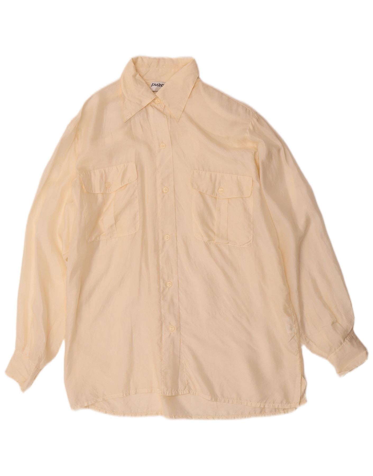 - AI opis: Ova Vintage ženska košulja izrađena je od 100 posto čistog svilenog satena u nježno bež nijansi. Njegova lagana, pomalo prozirna tkanina nudi luksuzan osjećaj. Ima klasični izrez s ovratnikom i potpuno kopčanje sprijeda. Dugi rukavi završavaju s manšetama na gumbe. Dva džepa na prsima dodaju praktične detalje. Opušteni kroj osigurava udobno nošenje i lepršavu siluetu.