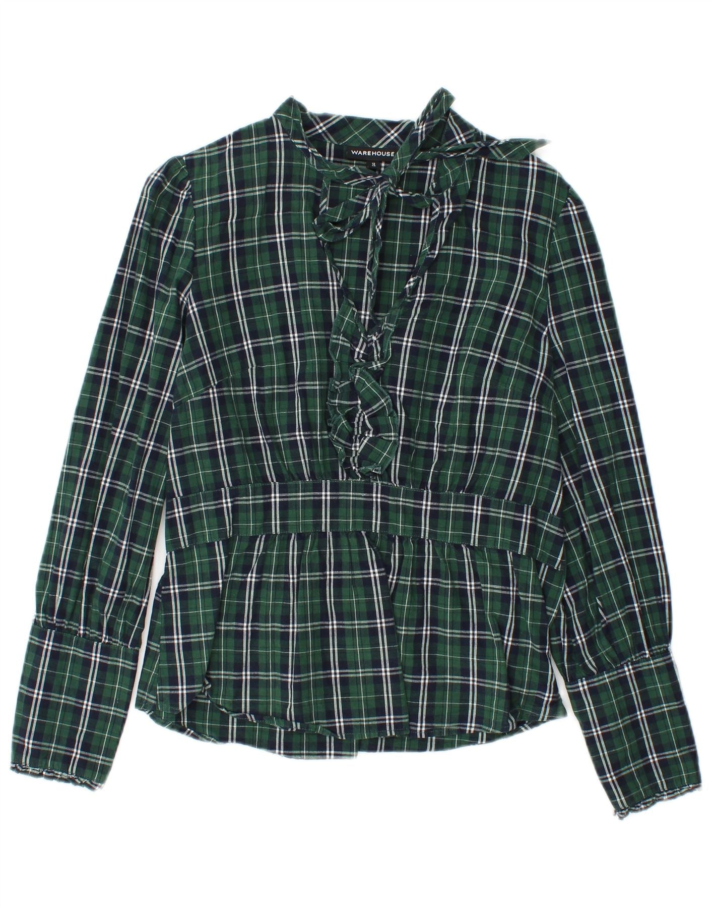- AI opis: Ovaj gornji dio ženske bluze Warehouse izrađen je od 100 posto pamučne tkanine. Ima klasični zeleni, tamnoplavi i bijeli karirani uzorak. Visoki ovratnik i prednja strana s volanima dodaju elegantan detalj. Dugi rukavi završavaju elegantnim manžetama na zapešćima. Peplum kroj stvara laskavu siluetu, stegnutu diskretnim patentnim zatvaračem. Ovaj obični kroj nudi sofisticiran, ali udoban stil.