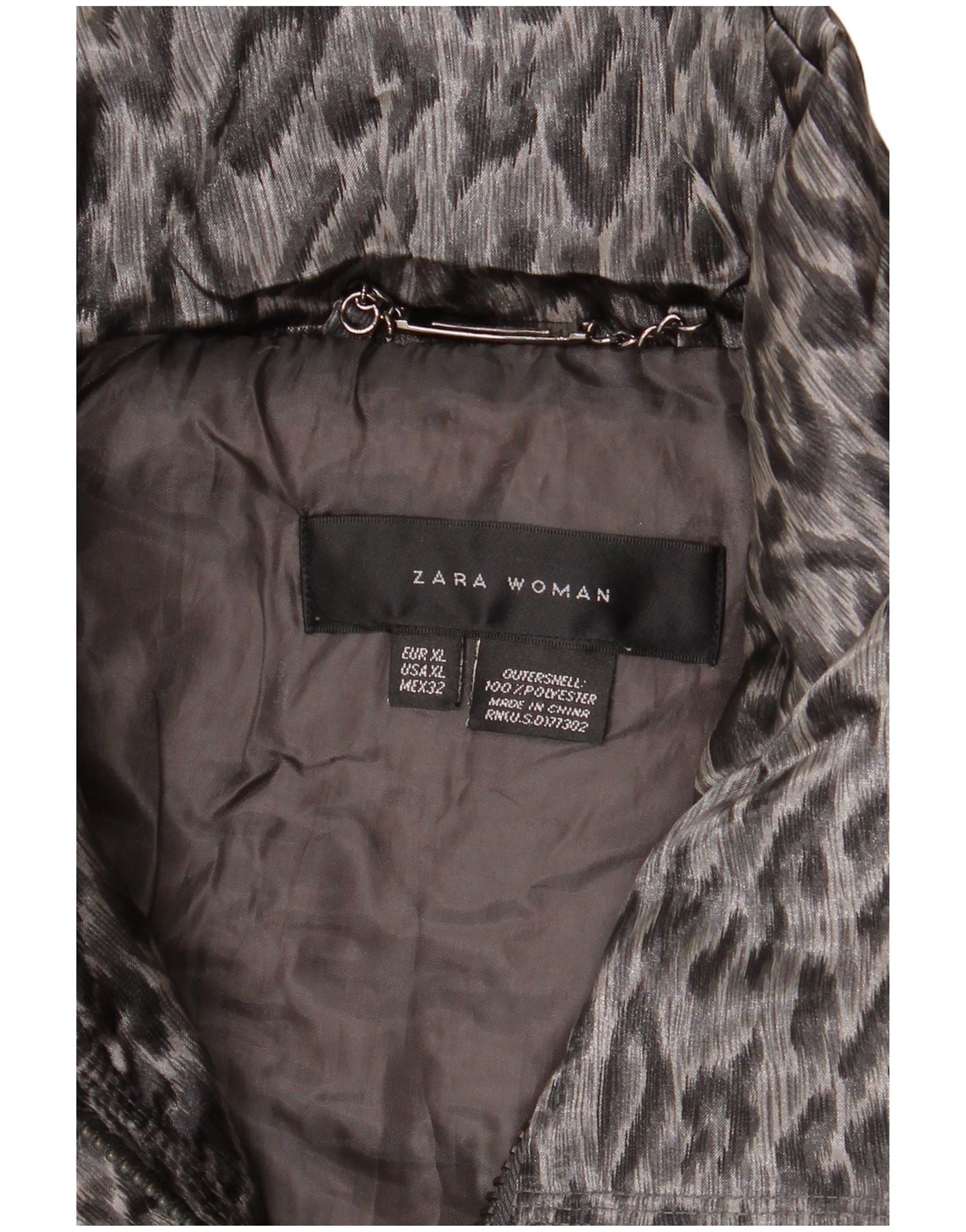 - AI opis: Ova Zara ženska podstavljena jakna izrađena je od 100 posto poliestera, nudeći glatku, ali prošivenu teksturu. Sadrži upečatljiv sivi uzorak životinjskog uzorka. Visoki ovratnik i dugi rukavi pružaju toplinu i pokrivaju. Potpuni patentni zatvarač osigurava praktičnost. Ima pravilan kroj za udobno nošenje. Uključeni su praktični džepovi koji poboljšavaju njegov funkcionalni dizajn.