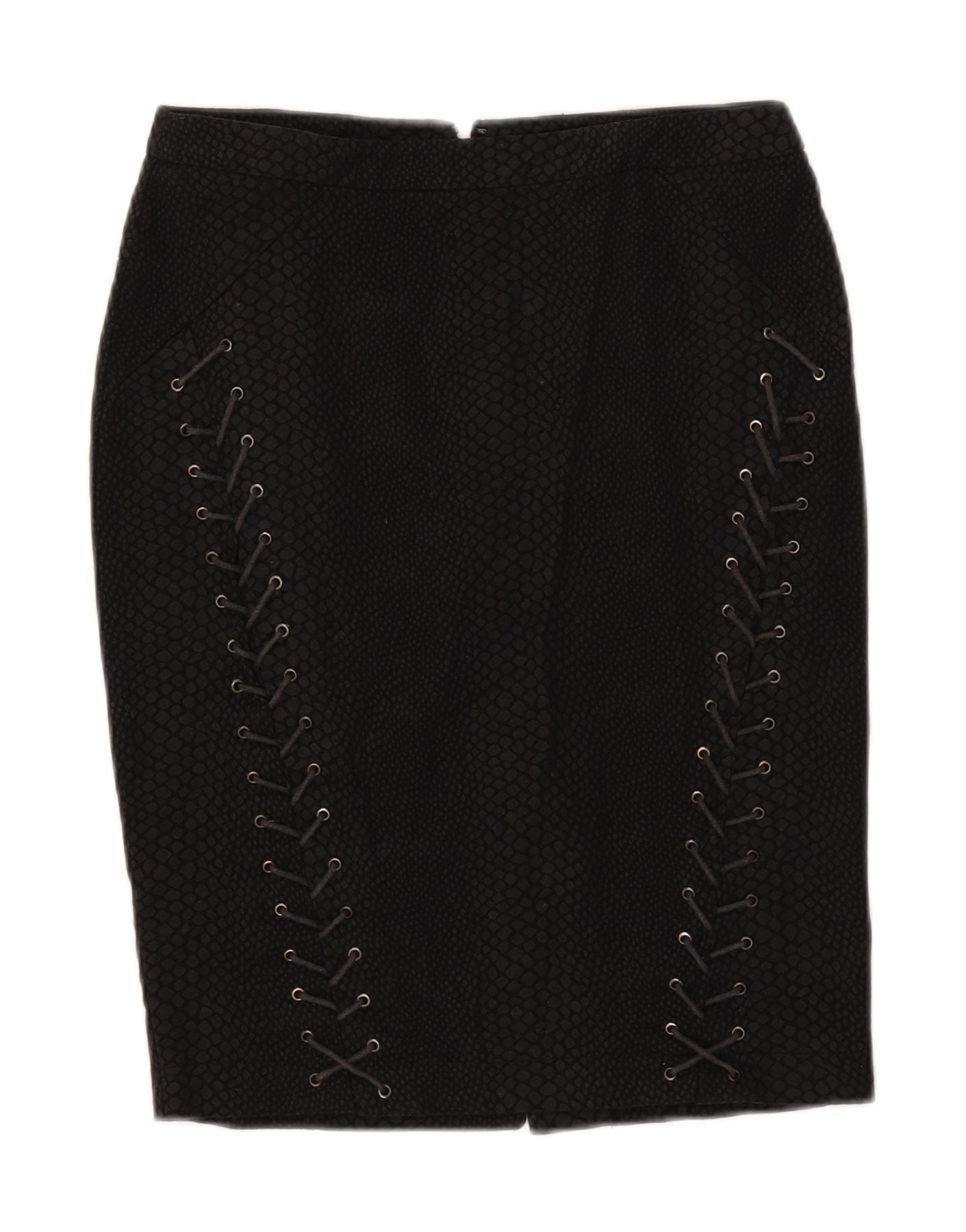 - AI opis: Ova Zara ženska pencil suknja izrađena je od crnog tkanog materijala, sa suptilnom teksturom životinjskog uzorka. Njegova uska silueta nudi elegantan, suvremen izgled. Diskretno zatvaranje stražnjim patentnim zatvaračem osigurava glatku završnu obradu. Upečatljivi detalji na vezivanje spuštaju se s obje strane, dodajući prepoznatljiv naglasak inspiriran rockom. Ovaj dizajn podiže klasičnu pencil suknju s modernim rubom.